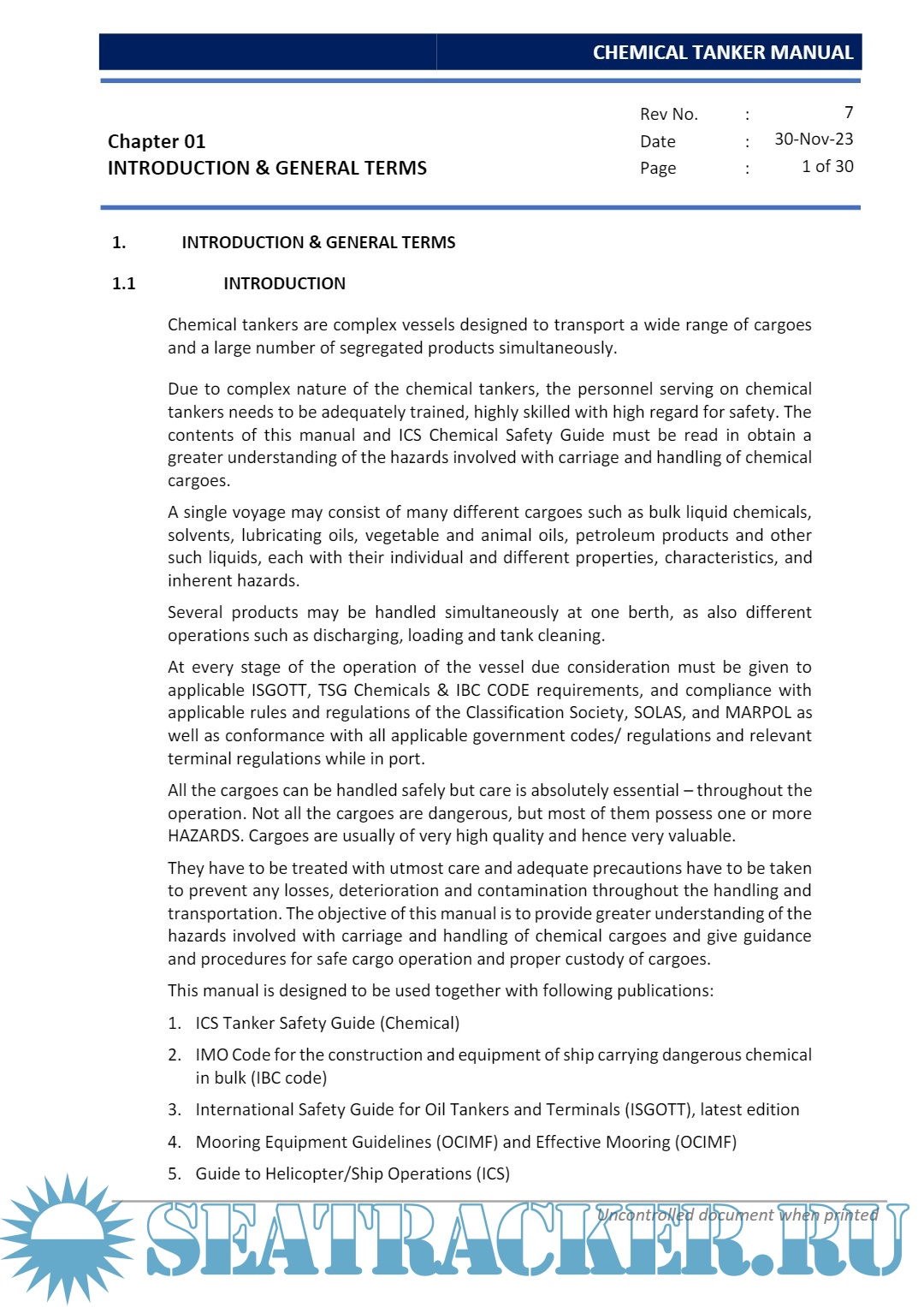 Description: This Manual is issued to assist all personnel involved in the operation of Chemical Tankers which are complex vessels designed to transport a wide range of cargoesand a large number of segregated products simultaneously.