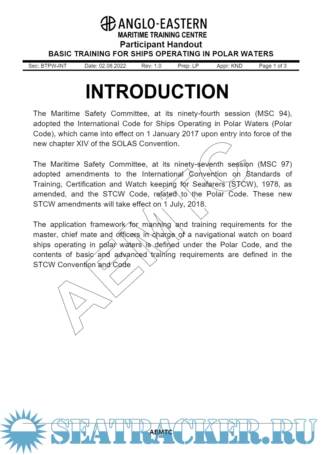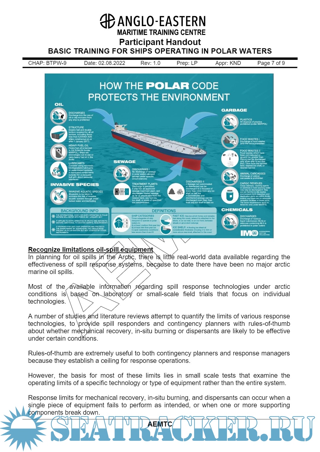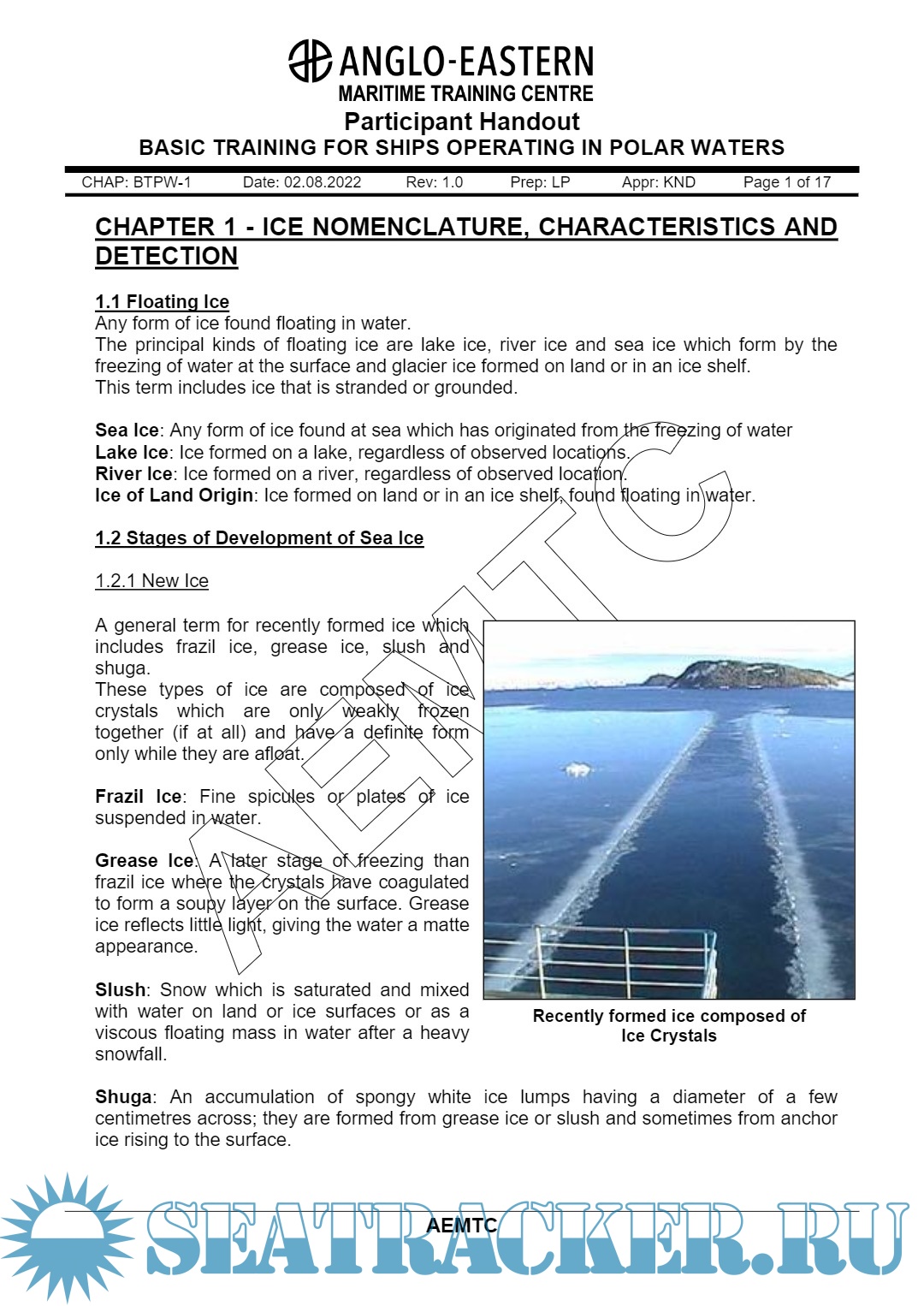 Year: 2022 Language: English Author: AEMTC Genre: Training courses Publisher: Anglo Eastern Maritime Training Centre (AEMTC) Edition: Rev. 1.0 Format: PDF Quality: eBook Pages count: 121 Description: Basic Training for Polar Waters A Five Days Course for Deck Officers. Participant Handout. Aim of this course: This course provides training to navigation officers to operate ships in polar waters and to address those additioanl provisions deemed necessary for consideration beyond existing requirements of the SOLAS & MARPOL Conventions, in order to take into account the climatic conditions of polar waters and to meet appropriate standards of maritime safety and pollution prevention.