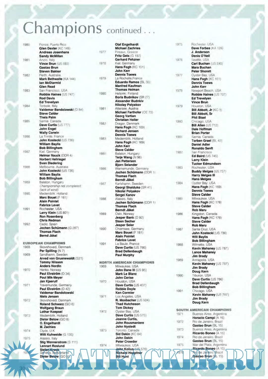 It has attempted to present some of the Class' history in story form as well as the names of its winning skippers of many regattas. Crew names are too often lost to attempt their inclusion on every occasion, but we recognize that most of the skippers owe their victories to the other two occupants of our boat. Collecting the material took more time than we allowed, so it will have to be for the next Guide to fill the gaps.