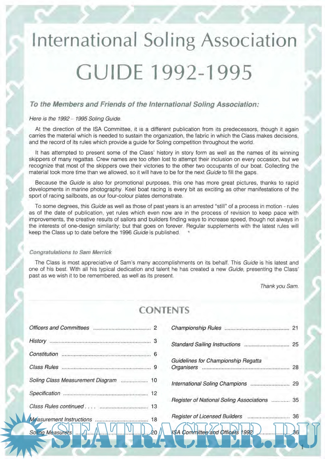 Year: 1992 Language: English Author: International Soling Association Genre: Manual Publisher: International Soling Association Format: PDF Quality: eBook Pages count: 44 Description: To the Members and Friends of the International Soling Association: Here is the 1992 - 1995 Soling Guide. At the direction of the ISA Committee, it is a different publication from its predecessors. though it again carries the material which is needed to sustain the organization, the fabric in which the Class makes decisions, and the record of its rules which provide a guide for Soling competition throughout the world. It has attempted to present some of the Class' history in story form as well as the names of its winning skippers of many regattas. Crew names are too often lost to attempt their inclusion on every occasion, but we recognize that most of the skippers owe their victories to the other two occupants of our boat. Collecting the material took more time than we allowed, so it will have to be for the next Guide to fill the gaps. Because the Guide is also for promotional purposes. this one has more great pictures, thanks to rapid developments in marine photography. Keel boat racing is every bit as exciting as other manifestations of the sport of racing sailboats, as our four-colour plates demonstrate. To some degrees, this Guide as well as those of past years is an arrested "still" of a process in motion - rules as of the date of publication, yet rules which even now are in the process of revision to keep pace with improvements, the creative results of sailors and builders finding ways to increase speed, though not always In the interests of one-design similarity; but that goes on forever. Regular supplements with the latest rules will keep the Class up to date before the 1996 Guide is published.