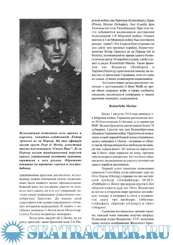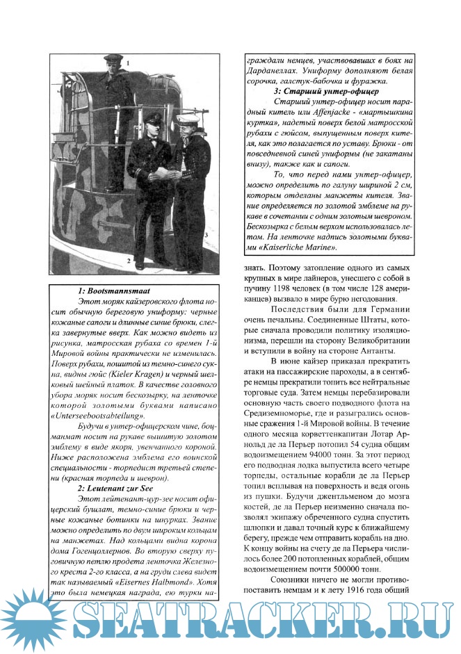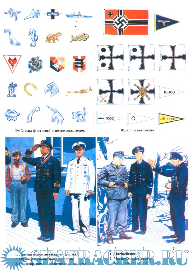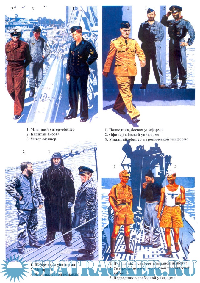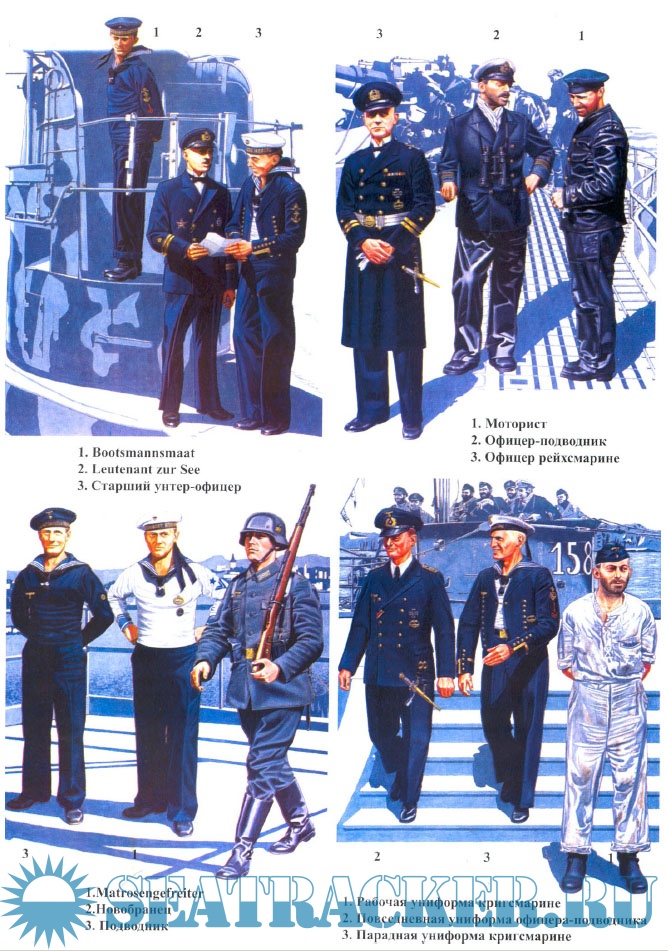 Содержание Kaiserliche Marine Между двумя войнами 2-я Мировая война 1939 1940 1941 1942 1943 1944 1945 Организация и структура управления Униформа экипажей U-ботов Китель и брюки Офицерский бушлат Матросский бушлат Парадный китель Матросская рубаха Брюки и обувь для синей униформы Рабочая рубаха Белый летний китель Рабочая куртка Серая полевая униформа Тропическая униформа Боевая униформа Кожаная униформа Униформа мотористов Униформа для палубной команды Штормовая униформа Головной убор Фуражка Matrosenmuetze Bordmuetze Тропические кепи Тропический шлем Каска Вязанная шапка Ремни, пряжки и личное снаряжение Оружие Штык Сабля Кортик Эмблемы и награды Кавалеры U-Boot Abzeichen mit Brillanten