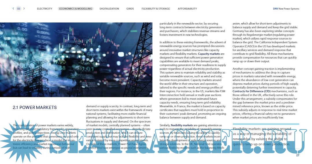 Year: 2024 Language: English Author: DNV Genre: Guide Format: PDF Quality: eBook Pages count: 82 Description: This report expands upon electricity forecast of our Energy Transition Outlook,2023. Experts in DNV’s Energy Systems unit have contributed additional material to this report in the fields of demand modelling, grid operations, digitalization and AI, and new market models and funding mechanisms for flexibility. In this report we deepen coverage in particular of: —Demand response and associated technical and financial considerations —Modelling power systems by the hour to gauge the impact of adverse weather, including a case covering a windless fortnight in the UK power market — Grid enhancing technologies — The impact of digitalization, with a focus on resistance to change, cyber security, and AI — The sensitivity of the flexibility market to heightened participation of the global EV fleet in providing vehicle-to-grid services, and to varying assumptions about the average duration of utility-scale Li-ion battery storage — Market designs to promote flexibility and long term investment in decarbonization of power