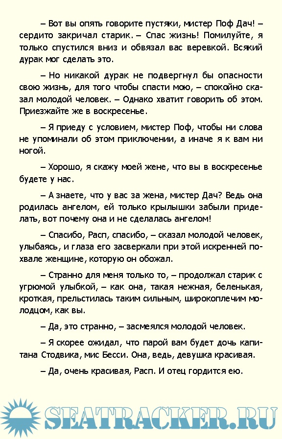 Содержание Сокровища глубин Глава I. Контора водолазных аппаратов Глава II. Золотые обещания Глава III. Под водой Глава IV. Домашний очаг Глава V. Сон наяву Глава VI. Приятный вечер Глава VII. Борьба Глава VIII. Нарушение соглашения Глава IX. Показание Полло Глава Х. Побег Глава XI. Наконец отправились Глава XII. В каюте Бесси Глава XIII. Приговор доктора Глава XIV. Подозрения капитана Глава XV. Утопающий Глава XVI. Безмолвное море Глава XVII. Окум ошибся.... Глава XVIII. Покровители сокровищ Глава XIX. У сокровищ Глава XX. Угощение для акул Глава XXI. Открытие Глава XXII. Опасность Глава XXIII. Тень сгущается Глава XXIV. Подводная экскурсия Глава XXV. Хитрая лисица Глава XXVI. Приключение Распа Глава XXVII. Доклад Полло Глава XXVIII. Хорошее намерение Глава XXIX. Тревоги Эстеры Глава XXX. Борьба за жизнь Глава XXXI. Пробуждение Глава XXXII. Смертельная борьба. Глава XXXIII. Ренегаты Глава XXXIV. Как непостоянны друзья Глава XXXV. Посол Окума Глава XXXVI. Рассказ Сэма Окума Глава XXXVII. Тайная услуга Глава XXXVIII. Словно серая змея Глава XXXIX. Дач в опасности Глава XL Планы Распа Глава XLI. Пленники Глава XLII. Рассказ Сэма Окума Глава XLIII. Прощайте Глава XLIV. Недоумение Глава XLV. Мщение Лоре Глава XLVI. Катастрофа Глава XLVII. Заключение