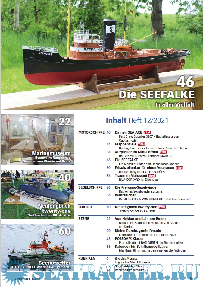 Year: 2021 Language: German Author: Mario Bicher (Redaktor) Genre: Periodical (magazine) Edition: 2021-12 Format: PDF Quality: eBook Pages count: 76 Description: SchiffsModell is the magazine for those who enjoy radio controlled and fully functional Modellnachbauten of ships of all kinds.