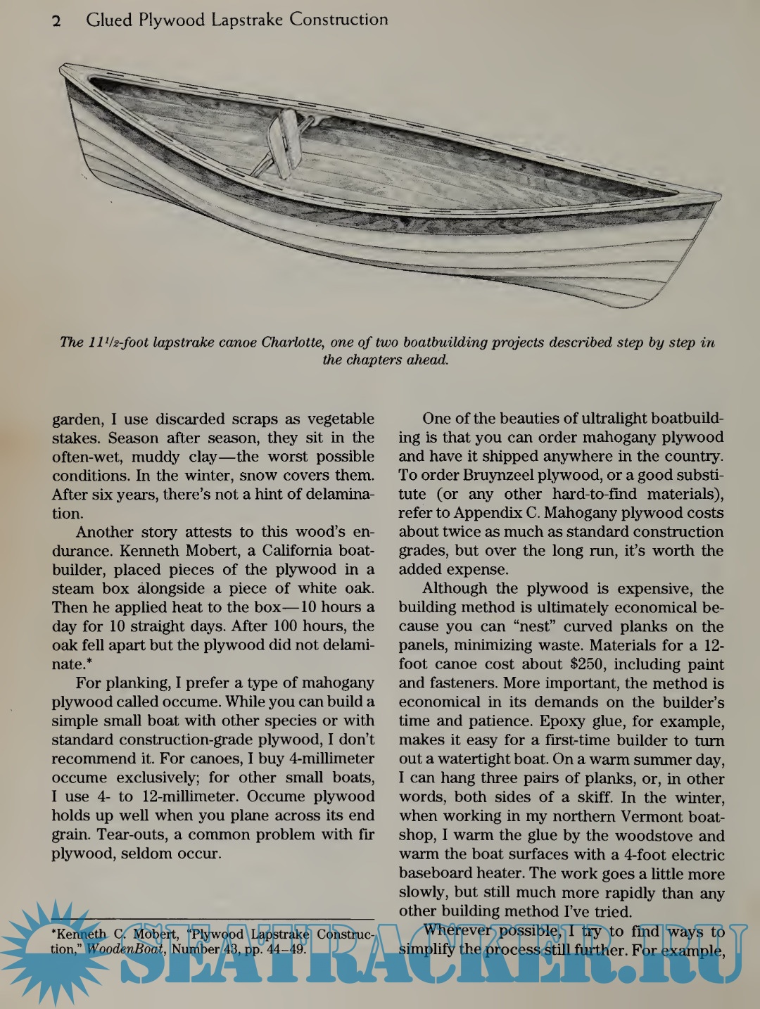 All the information you need is here. Tom Hill, the chief proponent of ultralight boatbuilding and its leading practitioner, describes the method from start to finish using a skiff and canoe as examples. In the appendix is a gallery of ultralight designs, all but one of which you can build without lofting. If you want more flexibility, however, you can adapt almost any lapstrake small-boat design, traditional or modern, to the ultralight method. With some lofting (directions for which are given) you may then build a wide range of boats whose offsets are available. And you may adjust planking thickness and scantlings to give your boat extremely light weight with normal strength, or moderate weight with great strength.