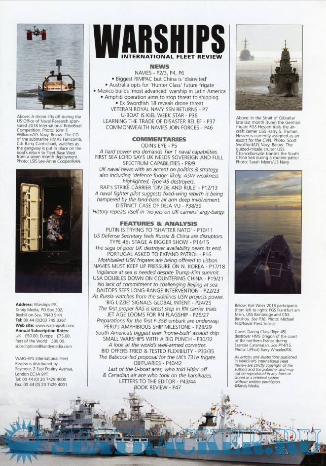 Description: Warships IFR puts the spotlight on the latest developments in the world’s navies. It covers current defence issues and has comments by leading analysts. The magazine regularly includes features on the Royal Navy and the US Navy in addition to incorporating news and features on all other navies across the globe. Warships IFR frequently carries in-depth articles on naval heritage.WARSHIPS International Fleet Review is published 12 times a year by Tandy Media Ltd who also publish Shipping Today & Yesterday (which provides news and features from the world of merchant shipping).