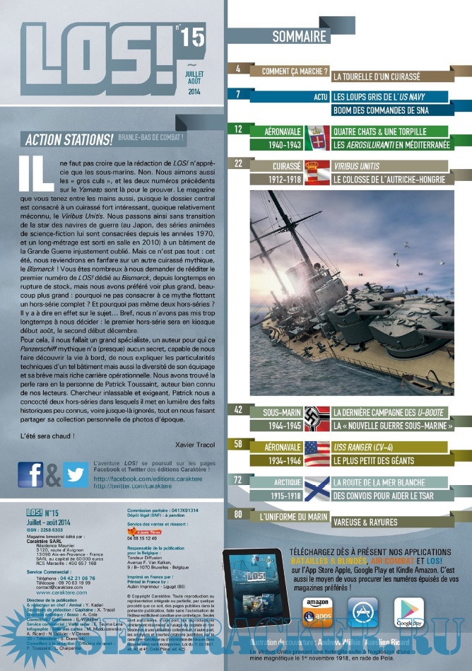 Year: 2014 Language: French Author: Collective Genre: Periodical publication Edition: 2014 07-08 Format: PDF Quality: eBook Pages count: 84 Description: LES ÉDITIONS CARAKTÈRE PRENNENT LE LARGE EN LANÇANT UN NOUVEAU MAGAZINE CONSACRÉ À LA GUERRE NAVALE !Les sujets passionnants ne manquent pas et LOS ! met un point d’honneur à les présenter au lecteur comme cela n’a jamais été fait dans la presse française jusqu’à présent. Un seul mot d’ordre pour l’équipe rédactionnelle : rigueur scientifique et présentation ludique !S’appuyant sur un fond photographique d’exception, sur des plans de bateaux et d’avions, les éditions Caraktère innovent une fois de plus en vous proposant aussi des vues 3D détaillées, le tout au service de textes soigneusement rédigés par des auteurs spécialisés. Vous comprendrez ainsi comment fonctionne un submersible, comment se déroule un combat naval, comment est conçu un cuirassé ou comment attaquent les avions-torpilleurs !Revivez au fil des pages l’aventure humaine exceptionnelle des matelots de la marine marchande affrontant les U-Boote en Arctique, ou celle des pilotes embarqués sur les porte-avions américains et japonais. Lisez les exploits des hommes-grenouilles italiens en Méditerranée, des équipages des vedettes lance-torpilles dans la Manche, des sous-marins soviétiques de la guerre froide ou des grands cuirassés de 1914-18