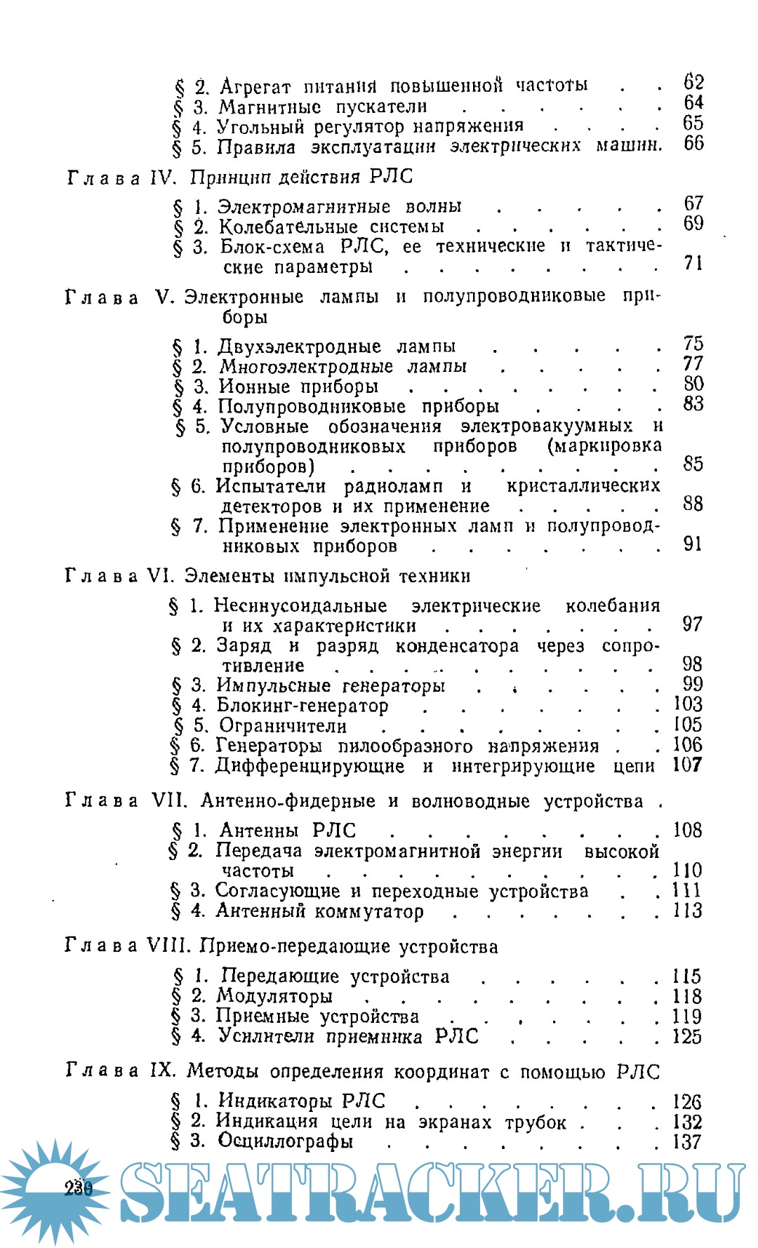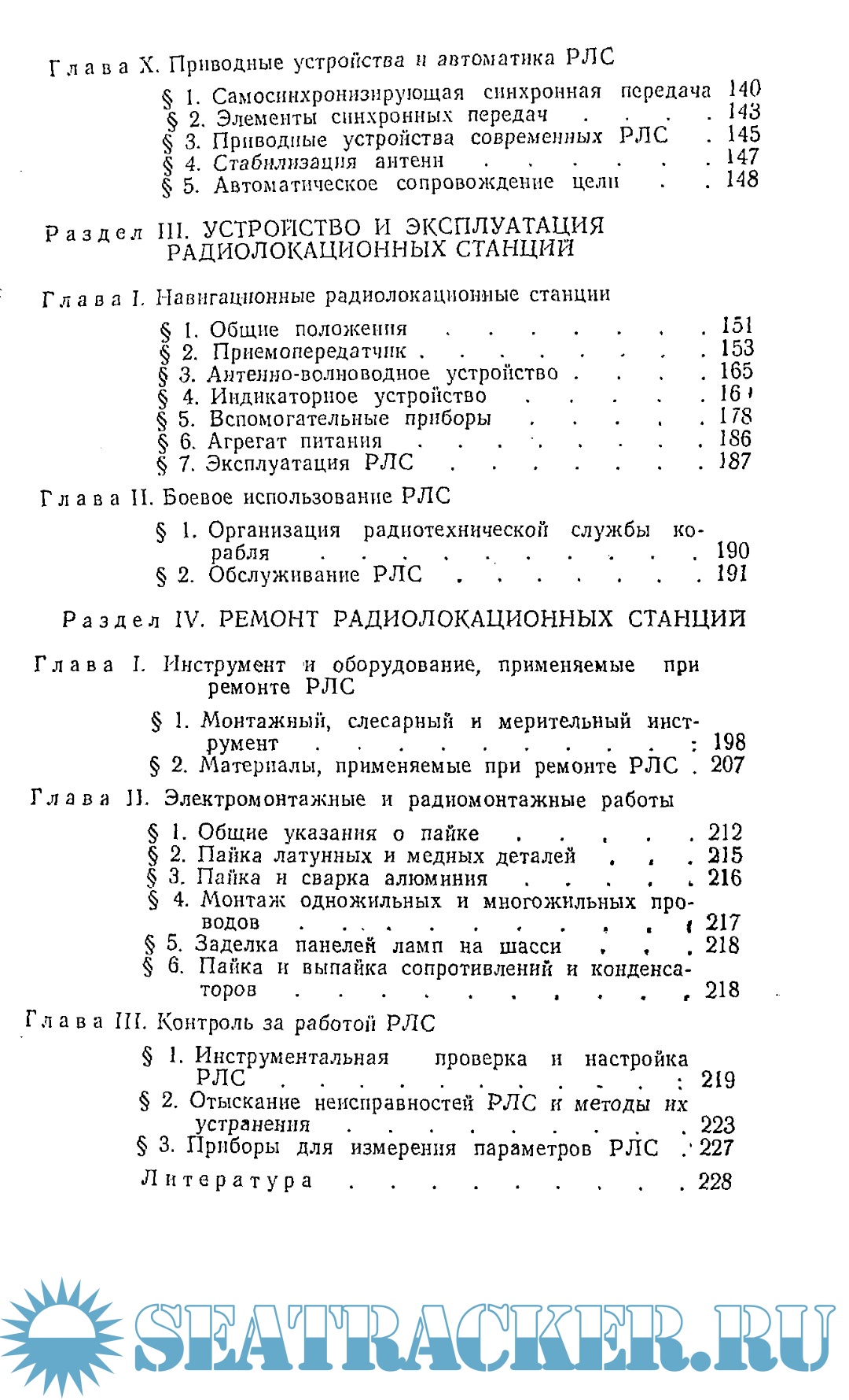 В первом разделе приведены краткие сведения по основам кораблевождения, без знаний которых сложно усвоить назначение и использование штурманских радиолокационных станций. Основы электротехники и радиолокации изложены во втором разделе в виде справочного материала. Главным в пособии является третий раздел — Устройство и эксплуатация радиолокационных станций. В нем излагается принцип работы радиолокационной станции в целом и каждого ее элемента в отдельности, описывается конструкция приемо-передающих, антенно-волноводных и индикаторных устройств, различных агрегатов и приборов. В последующих главах и параграфах приведены материалы по эксплуатации, обслуживанию и боевому применению штурманских радиолокационных станций корабля. Четвертый раздел пособия посвящен вопросам ремонта радиолокационных станций.