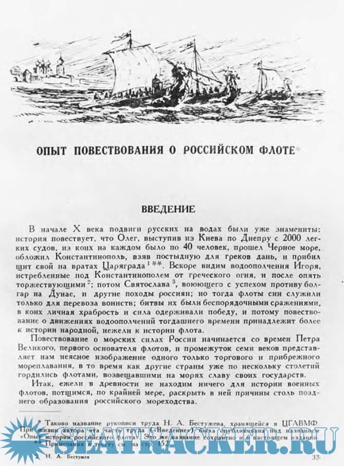 Год выпуска: 1961 Язык: Русский Автор: Бестужев Н.А. Жанр: Историческое Издательство: Государственное союзное издательство судостроительной промышленности Формат: DjVu Качество: Отсканированные страницы Количество страниц: 89 Описание: В книге впервые полностью публикуется рукопись декабриста Н. А. Бестужева, посвященная истории русского флота и кораблестроения с древнейших времен до 1714 г. Н. А. Бестужев показывает развитие русского флота на фоне общественно-политической жизни страны. Подробно описаны: древнее русское мореходство, создание русского регулярного флота при Петре I и первая выдающаяся победа русского флота при Гангуте в 1714 г.