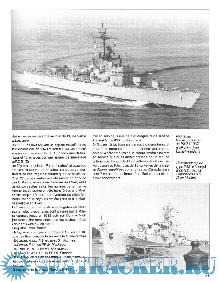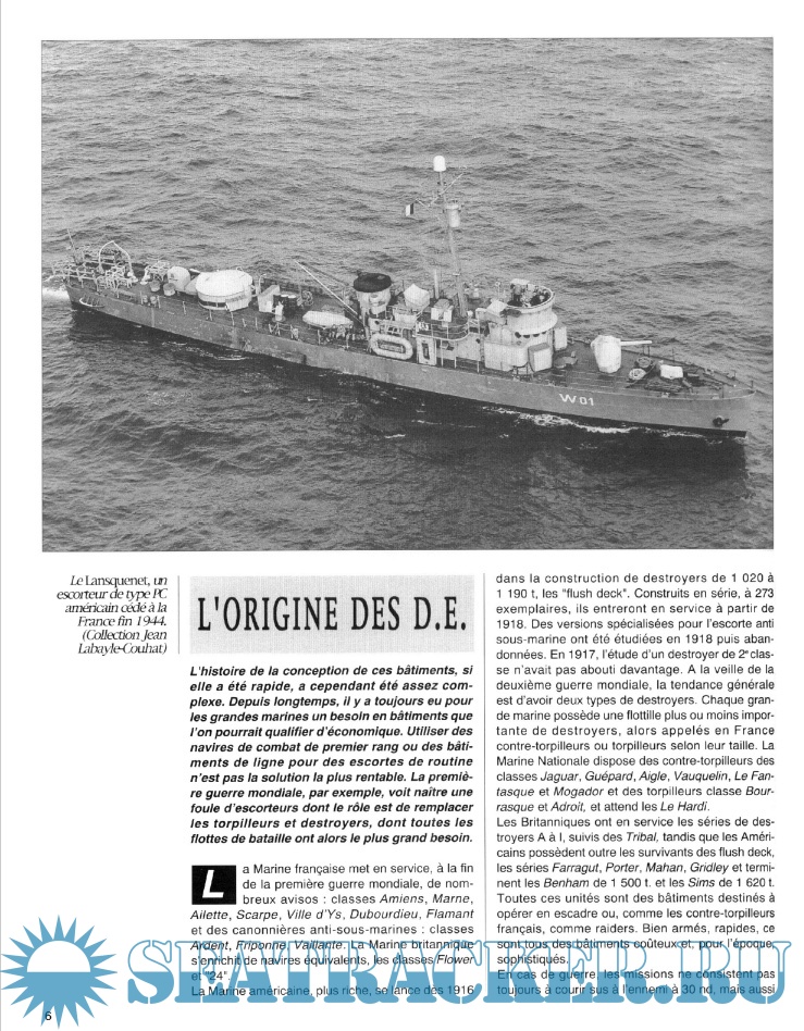 Year: 2004 Language: French Author: Jean Moulin Genre: Historical Format: PDF Quality: Scanned pages Pages count: 153 Description: Pour combattre les sous-marins allemands dans la bataille de l'Atlantique, les chantiers américains construisent entre 1942 et 1945 une série de plus de 500 unités appelées destroyers d'escorte (DE). La Marine nationale en arme six début 1944 pour démarrer sa reconstitution après les pertes de 1942, puis huit autres en 1950 et 1952, dans le cadre de l'OTAN, le traité de l'Atlantique Nord. Ces quatorze bâtiments, devenus les escorteurs type Sénégalais, permettent à la Marine d'assurer ses missions jusqu'à la fin des années cinquante, notamment l'entraînement à la lutte anti-sous-marine et la surveillance maritime en Algérie, en attendant la mise en service des escorteurs rapides issus des programmes d'après guerre.