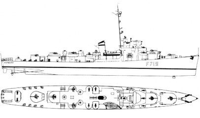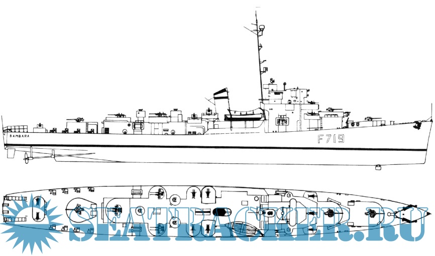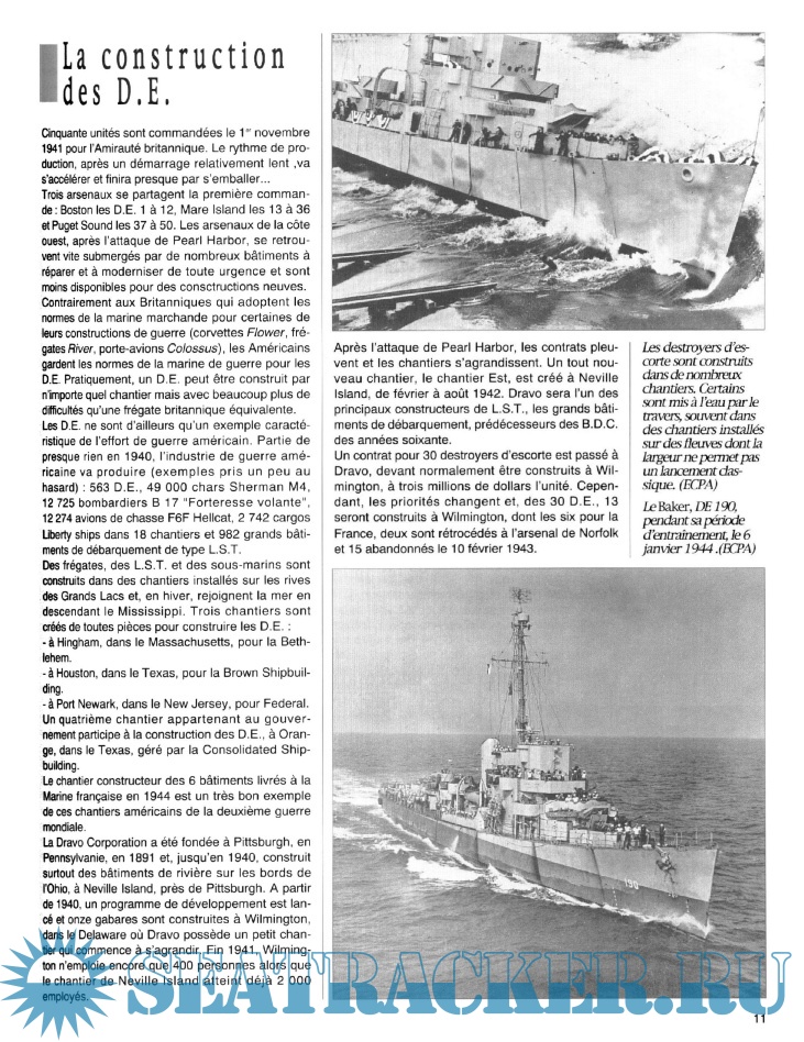 Description: Pour combattre les sous-marins allemands dans la bataille de l'Atlantique, les chantiers américains construisent entre 1942 et 1945 une série de plus de 500 unités appelées destroyers d'escorte (DE). La Marine nationale en arme six début 1944 pour démarrer sa reconstitution après les pertes de 1942, puis huit autres en 1950 et 1952, dans le cadre de l'OTAN, le traité de l'Atlantique Nord. Ces quatorze bâtiments, devenus les escorteurs type Sénégalais, permettent à la Marine d'assurer ses missions jusqu'à la fin des années cinquante, notamment l'entraînement à la lutte anti-sous-marine et la surveillance maritime en Algérie, en attendant la mise en service des escorteurs rapides issus des programmes d'après guerre.