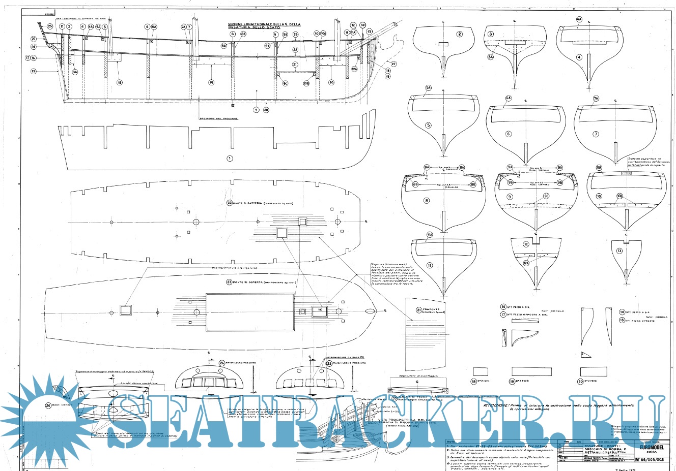 Год выпуска: 1977 Язык: Английский Автор: Euromodel Жанр: Инструкция, Чертеж, Кто действительно занимается судо- (и не только) моделизмом :) Издательство: Euromodel Формат: TIFF Качество: Отсканированные страницы Количество страниц: 36 Описание: История корабля AIAX HMS AIAX – британский корабль, построенный в 1765 году. Его долго доводили до ума, и в результате свое первое путешествие судно совершило лишь в 1770 году, отправившись к Североамериканскому континенту. HMS AIAX показал себя с хорошей стороны, выполняя регулярные рейсы, пока в 1786 году не попал в шторм, нанесший ему серьезные повреждения. После окончания бури, команда приняла посильные меры и отвела судно в Шотландию, после чего HMS AIAX отправился на капитальный ремонт в Плимут. Его удалось привести в порядок, и после кратковременной службы корабль отправился на 12 летний прикол, пока очередная война с французами в 1801 году не заставила Адмиралтейство мобилизовать все свои ресурсы. Судно лишилось всех декораций, которые убрали, стараясь снизить вес, необходимый для установки дополнительных орудий. Так здесь традиционные 4-фунтовые пушки заменили 8-фунтовой артиллерией. Подводную часть корабля обшили медными пластинами, оберегая судно от разрушения. Кроме этого, здесь существенно увеличили общий размер парусов, что создало скоростные преимущества. Столь масштабная модернизация позволила кораблю успешно решать боевые задачи. HMS AIAX принимал участие в осаде Тулона, а затем активно сражался в Трафальгарской битве, где проявил себя с наилучшей стороны. Он нанес серьезные повреждения испанскому судну и захватил один французский корабль. После 1805 года сведения о нем отсутствуют и есть все основания полагать, что HMS AIAX вывели из состава британского флота. Описание набора для постройки модели корабля AIAX Набор для постройки модели судна выполнен специалистами концерна EUROMODEL. Его отличает богатая комплектация и применение надежных материалов, что превращает готовое изделие в украшение коллекции. Корпус выполняется из вырезанных с помощью лазера элементов, а затем обшивается двойным слоем рейки. Вниз идет липа, а верхний слой производится из ореха. Этот же материал идет на палубный настил, здесь вниманию авторов предлагаются 4 мм рейки, имеющие темный оттенок. Кроме этого, орех представлен форштевнем, который сделан из цельной заготовки. Артиллерия корабля включает два вида латунных орудий, а именно 12 пушек весом 4 фунта и 26 пушек весом 8 фунтов. Все они располагаются на деревянных подставках, причем здесь детально проработаны даже колеса. Производитель представил проработанные элементы декора, изготовленные из белого металла и дерева. Идущие в комплектации корабельные шлюпки выполнены из декоративной смолы и отличаются высоким качеством. Орех послужил материалом для некоторых элементов такелажной оснастки, а именно юферсов, которые отлично сочетаются с различными блоками, изготовленными из желтого самшита. Также в наборе даны нити различного диаметра, а шелковые знамена позволяют привнести в общий облик корабля последний штрих. Приятным сюрпризом станет подставка, процесс сборки существенно облегчат полноразмерные чертежи, выполненные на 12 листах.