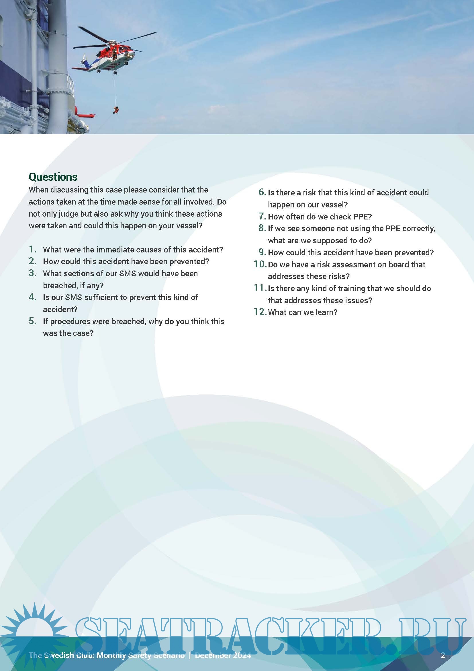 Year: 2024 Language: English Author: the Swedish Club Genre: Periodical publication Edition: December 2024 Format: PDF Quality: eBook Pages count: 3 Description: The Club is publishing, on a monthly basis, a new Monthly Safety Scenario (MSS) to assist owners in their efforts of complying with the above regulations. Alternative scenarios will be uploaded in SCOL. It is easy to download the MSS and enter the written conclusions from the meeting and send feedback to the shore-based organisation. Issue December, 2024 | Fall from Bosun chair. Under the ISM requirement, owners are obliged to carry out monthly safety meetings or safety committee meetings onboard their vessels. This obligation stems from Chapter 5 of the ISM Code: “Master’s responsibility and authority” and furthermore from “5.1.2, motivating the crew in the observation of that policy.
