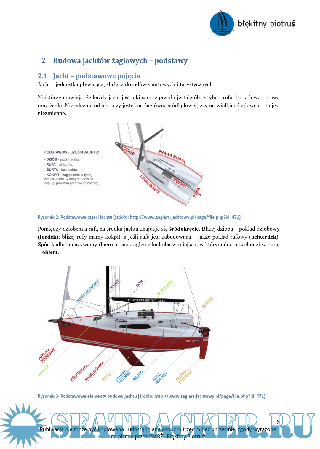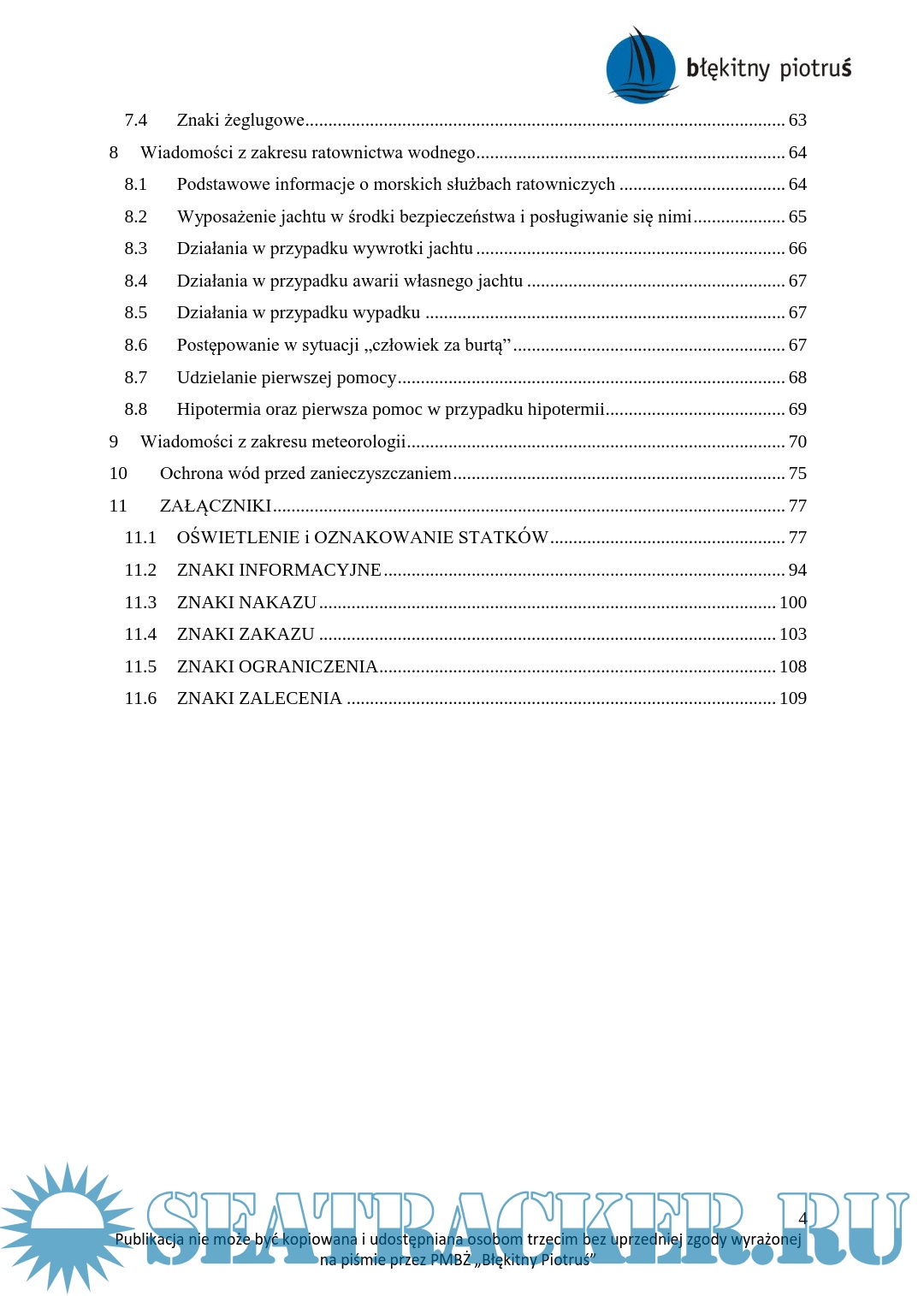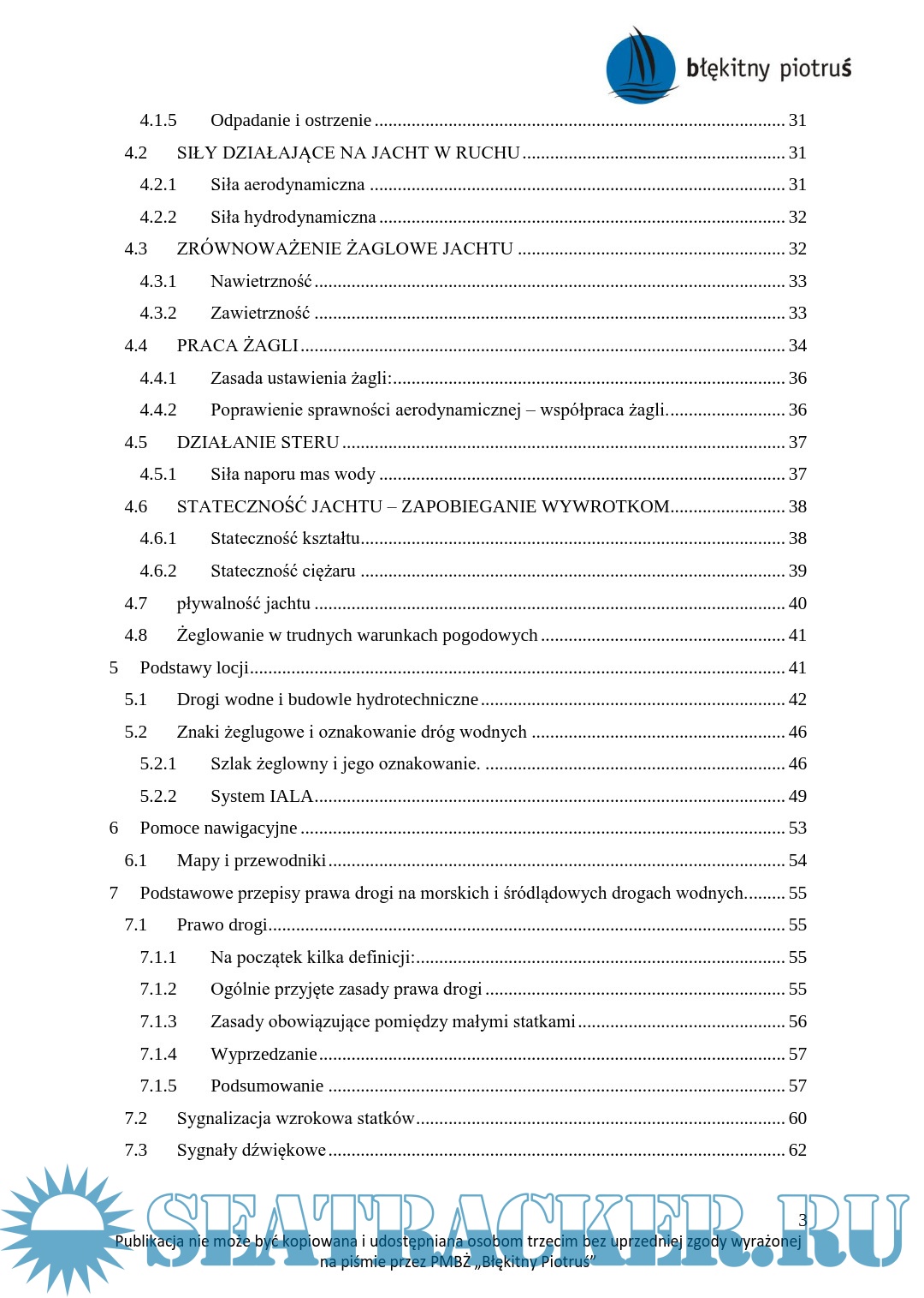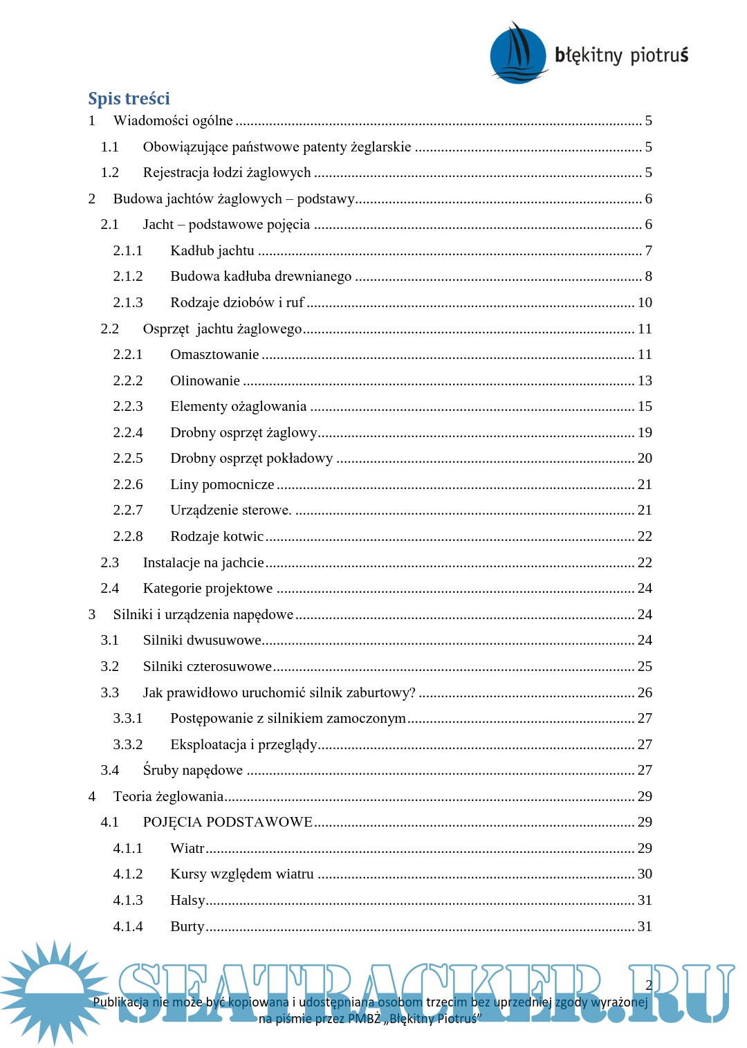 Wiadomości ogólne. Obowiązujące państwowe patenty żeglarskie. Rejestracja łodzi żaglowych. Budowa jachtów żaglowych – podstawy. Jacht – podstawowe pojęcia. Kadłub jachtu. Budowa kadłuba drewnianego. Rodzaje dziobów i ruf. Osprzęt jachtu żaglowego. Omasztowanie. Olinowanie. Elementy ożaglowania. Drobny osprzęt żaglowy. Drobny osprzęt pokładowy. Liny pomocnicze. Urządzenie sterowe. Rodzaje kotwic. Instalacje na jachcie. Kategorie projektowe. Silniki i urządzenia napędowe. Silniki dwusuwowe. Silniki czterosuwowe. Jak prawidłowo uruchomić silnik zaburtowy? Postępowanie z silnikiem zamoczonym. Eksploatacja i przeglądy. Śruby napędowe. Teoria żeglowania. Pojęcia podstawowe. Wiatr. Kursy względem wiatru. Halsy. Burty. Odpadanie i ostrzenie. Siły działające na jacht w ruchu. Siła aerodynamiczna. Siła hydrodynamiczna. Zrównoważenie żaglowe jachtu. Nawietrzność. Zawietrzność. Praca żagli. Zasada ustawienia żagli. Poprawienie sprawności aerodynamicznej – współpraca żagli. Działanie steru. Siła naporu mas wody. Stateczność jachtu – zapobieganie wywrotkom. Stateczność kształtu. Stateczność ciężaru. Pływalność jachtu. Żeglowanie w trudnych warunkach pogodowych. Podstawy locji. Drogi wodne i budowle hydrotechniczne. Znaki żeglugowe i oznakowanie dróg wodnych. Szlak żeglowny i jego oznakowanie. System IALA. Pomoce nawigacyjne. Mapy i przewodniki. Podstawowe przepisy prawa drogi na morskich i śródlądowych drogach wodnych. Prawo drogi. Na początek kilka definicji. Ogólnie przyjęte zasady prawa drogi. Zasady obowiązujące pomiędzy małymi statkami. Wyprzedzanie. Podsumowanie. Sygnalizacja wzrokowa statków. Sygnały dźwiękowe. Znaki żeglugowe. Wiadomości z zakresu ratownictwa wodnego. Podstawowe informacje o morskich służbach ratowniczych. Wyposażenie jachtu w środki bezpieczeństwa i posługiwanie się nimi. Działania w przypadku wywrotki jachtu. Działania w przypadku awarii własnego jachtu. Działania w przypadku wypadku. Postępowanie w sytuacji „człowiek za burtą”. Udzielanie pierwszej pomocy. Hipotermia oraz pierwsza pomoc w przypadku hipotermii. Wiadomości z zakresu meteorologii. Ochrona wód przed zanieczyszczaniem. Załączniki. Oświetlenie i oznakowanie statków. Znaki informacyjne. Znaki nakazu. Znaki zakazu. Znaki ograniczenia. Znaki zalecenia.