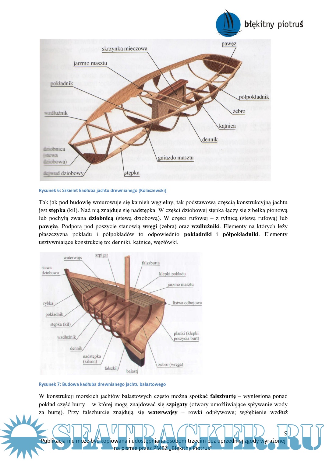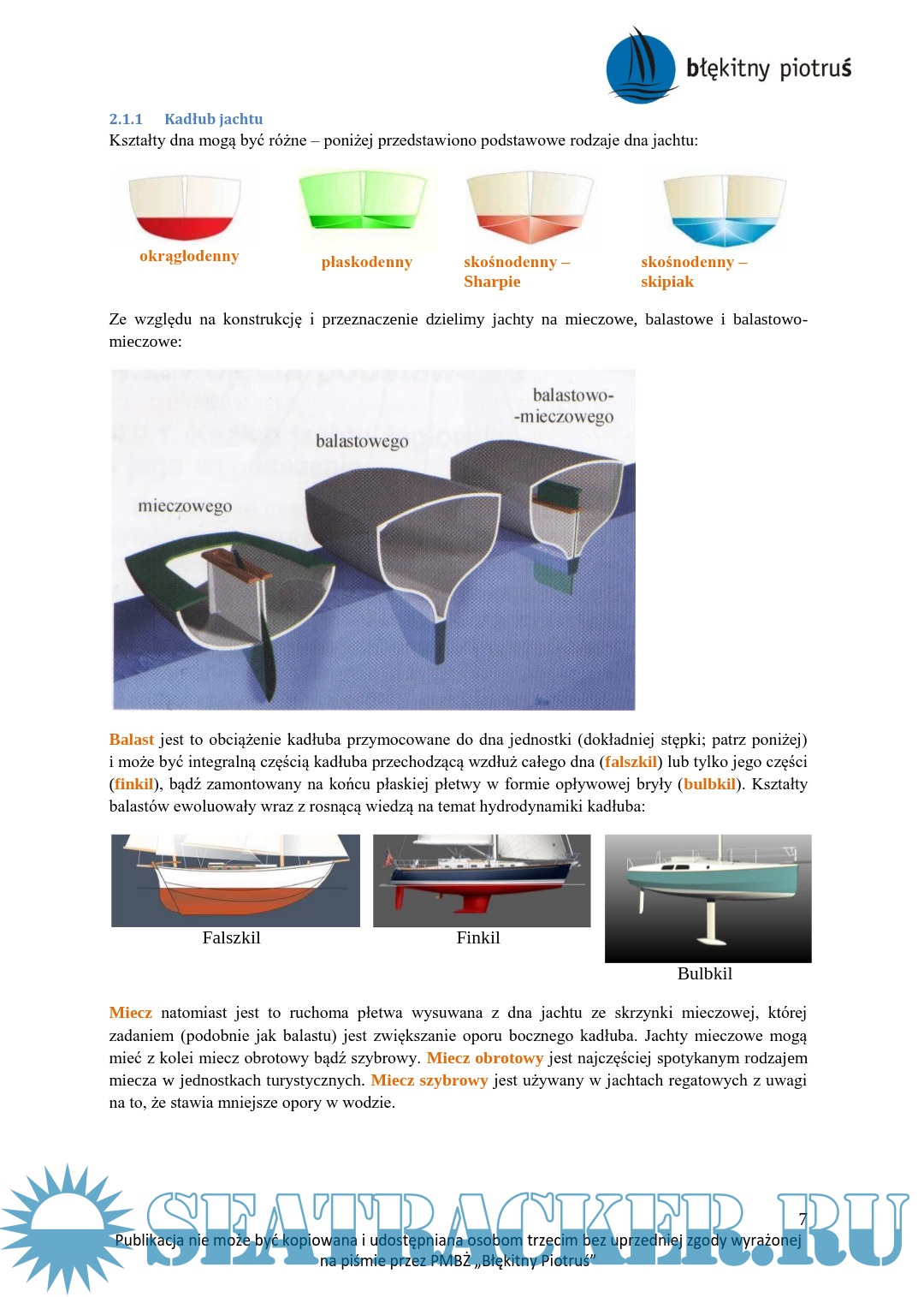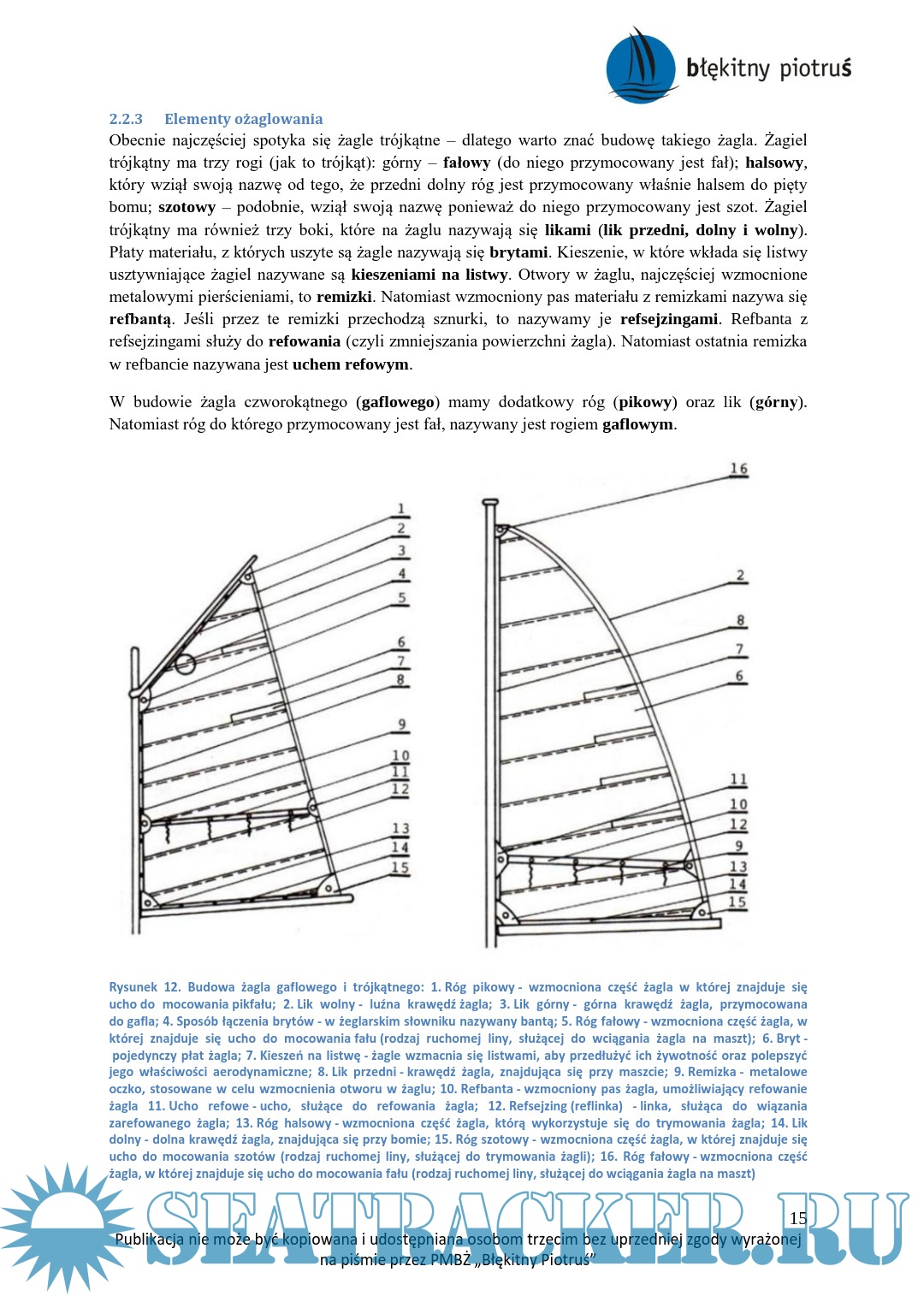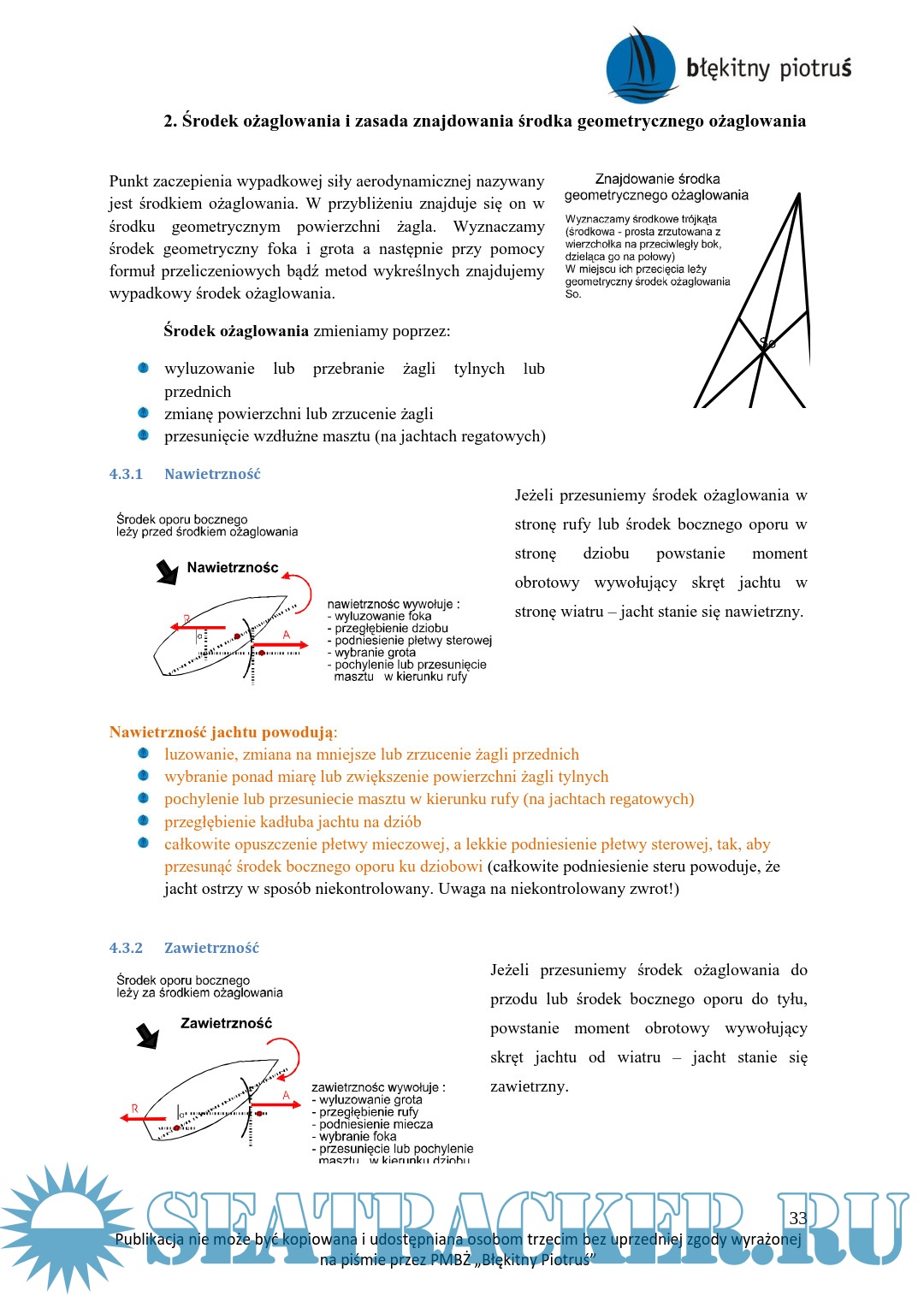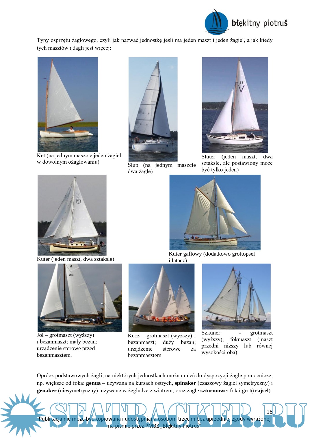 Wiadomości ogólne. Obowiązujące państwowe patenty żeglarskie. Rejestracja łodzi żaglowych. Budowa jachtów żaglowych – podstawy. Jacht – podstawowe pojęcia. Kadłub jachtu. Budowa kadłuba drewnianego. Rodzaje dziobów i ruf. Osprzęt jachtu żaglowego. Omasztowanie. Olinowanie. Elementy ożaglowania. Drobny osprzęt żaglowy. Drobny osprzęt pokładowy. Liny pomocnicze. Urządzenie sterowe. Rodzaje kotwic. Instalacje na jachcie. Kategorie projektowe. Silniki i urządzenia napędowe. Silniki dwusuwowe. Silniki czterosuwowe. Jak prawidłowo uruchomić silnik zaburtowy? Postępowanie z silnikiem zamoczonym. Eksploatacja i przeglądy. Śruby napędowe. Teoria żeglowania. Pojęcia podstawowe. Wiatr. Kursy względem wiatru. Halsy. Burty. Odpadanie i ostrzenie. Siły działające na jacht w ruchu. Siła aerodynamiczna. Siła hydrodynamiczna. Zrównoważenie żaglowe jachtu. Nawietrzność. Zawietrzność. Praca żagli. Zasada ustawienia żagli. Poprawienie sprawności aerodynamicznej – współpraca żagli. Działanie steru. Siła naporu mas wody. Stateczność jachtu – zapobieganie wywrotkom. Stateczność kształtu. Stateczność ciężaru. Pływalność jachtu. Żeglowanie w trudnych warunkach pogodowych. Podstawy locji. Drogi wodne i budowle hydrotechniczne. Znaki żeglugowe i oznakowanie dróg wodnych. Szlak żeglowny i jego oznakowanie. System IALA. Pomoce nawigacyjne. Mapy i przewodniki. Podstawowe przepisy prawa drogi na morskich i śródlądowych drogach wodnych. Prawo drogi. Na początek kilka definicji. Ogólnie przyjęte zasady prawa drogi. Zasady obowiązujące pomiędzy małymi statkami. Wyprzedzanie. Podsumowanie. Sygnalizacja wzrokowa statków. Sygnały dźwiękowe. Znaki żeglugowe. Wiadomości z zakresu ratownictwa wodnego. Podstawowe informacje o morskich służbach ratowniczych. Wyposażenie jachtu w środki bezpieczeństwa i posługiwanie się nimi. Działania w przypadku wywrotki jachtu. Działania w przypadku awarii własnego jachtu. Działania w przypadku wypadku. Postępowanie w sytuacji „człowiek za burtą”. Udzielanie pierwszej pomocy. Hipotermia oraz pierwsza pomoc w przypadku hipotermii. Wiadomości z zakresu meteorologii. Ochrona wód przed zanieczyszczaniem. Załączniki. Oświetlenie i oznakowanie statków. Znaki informacyjne. Znaki nakazu. Znaki zakazu. Znaki ograniczenia. Znaki zalecenia.