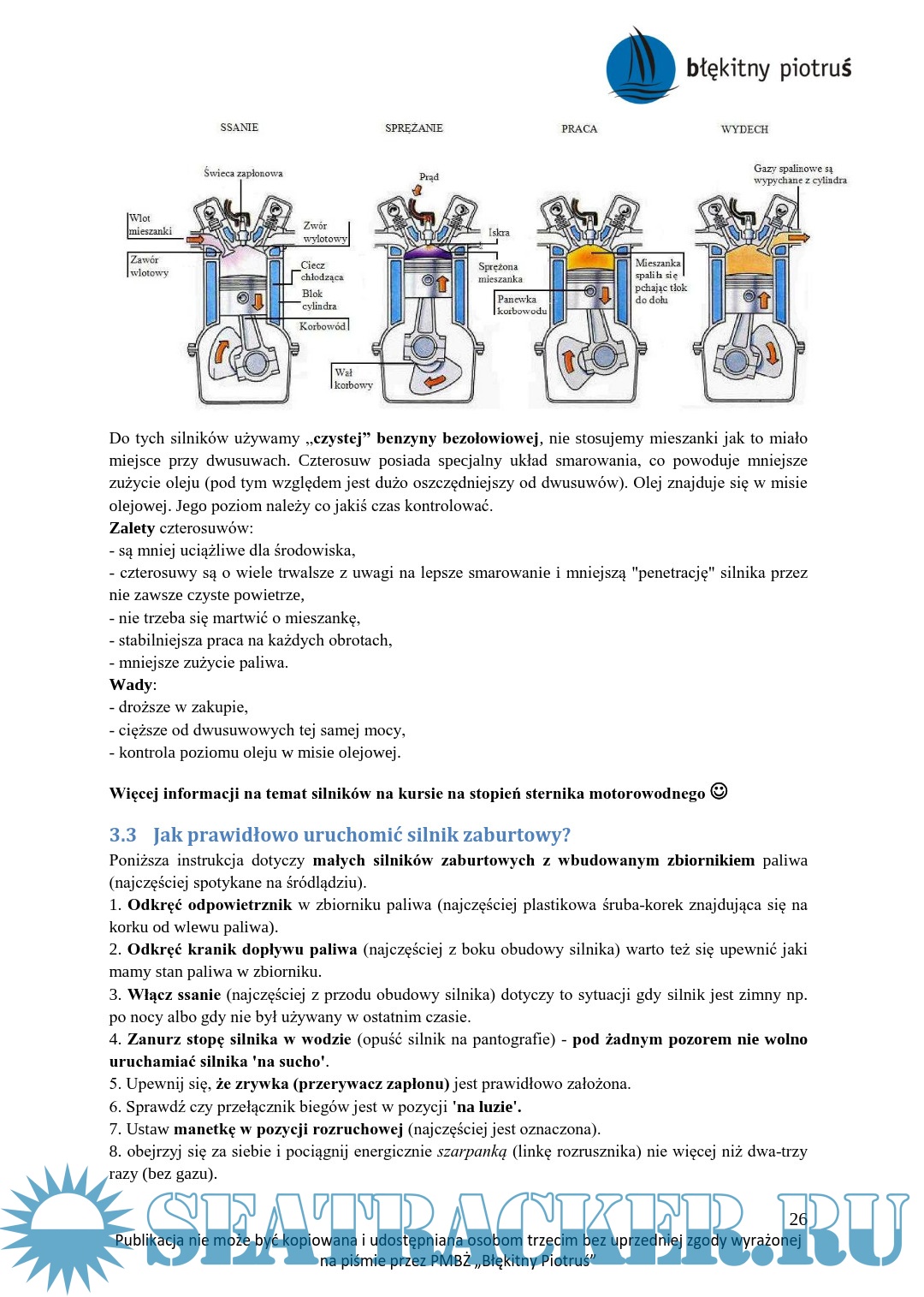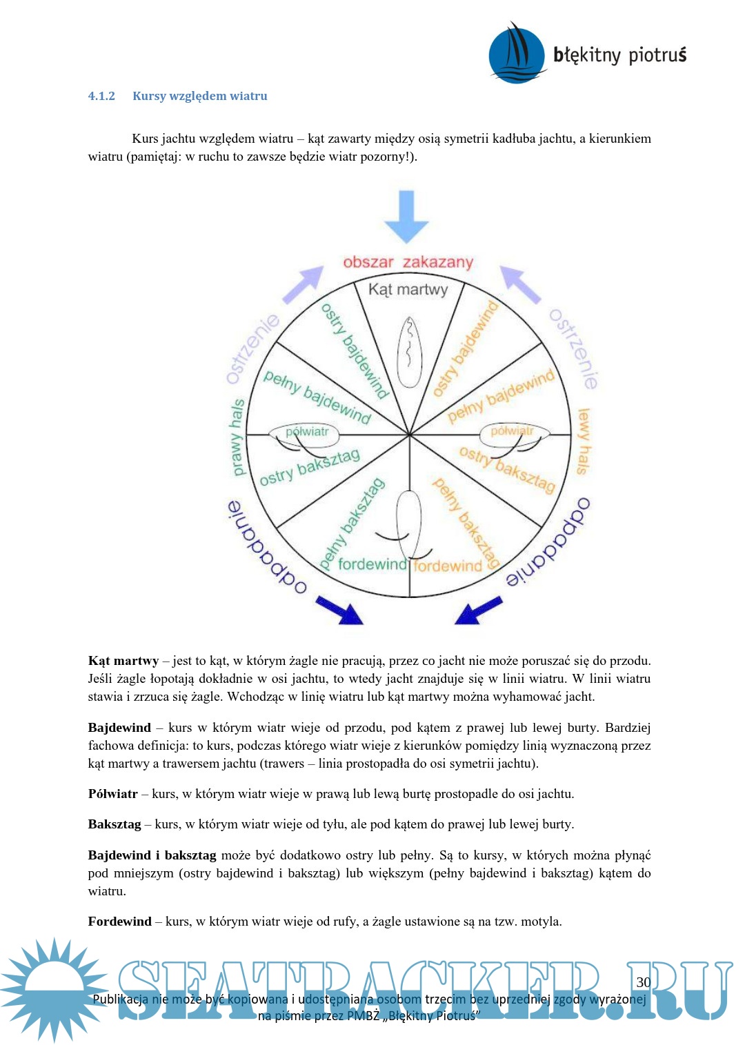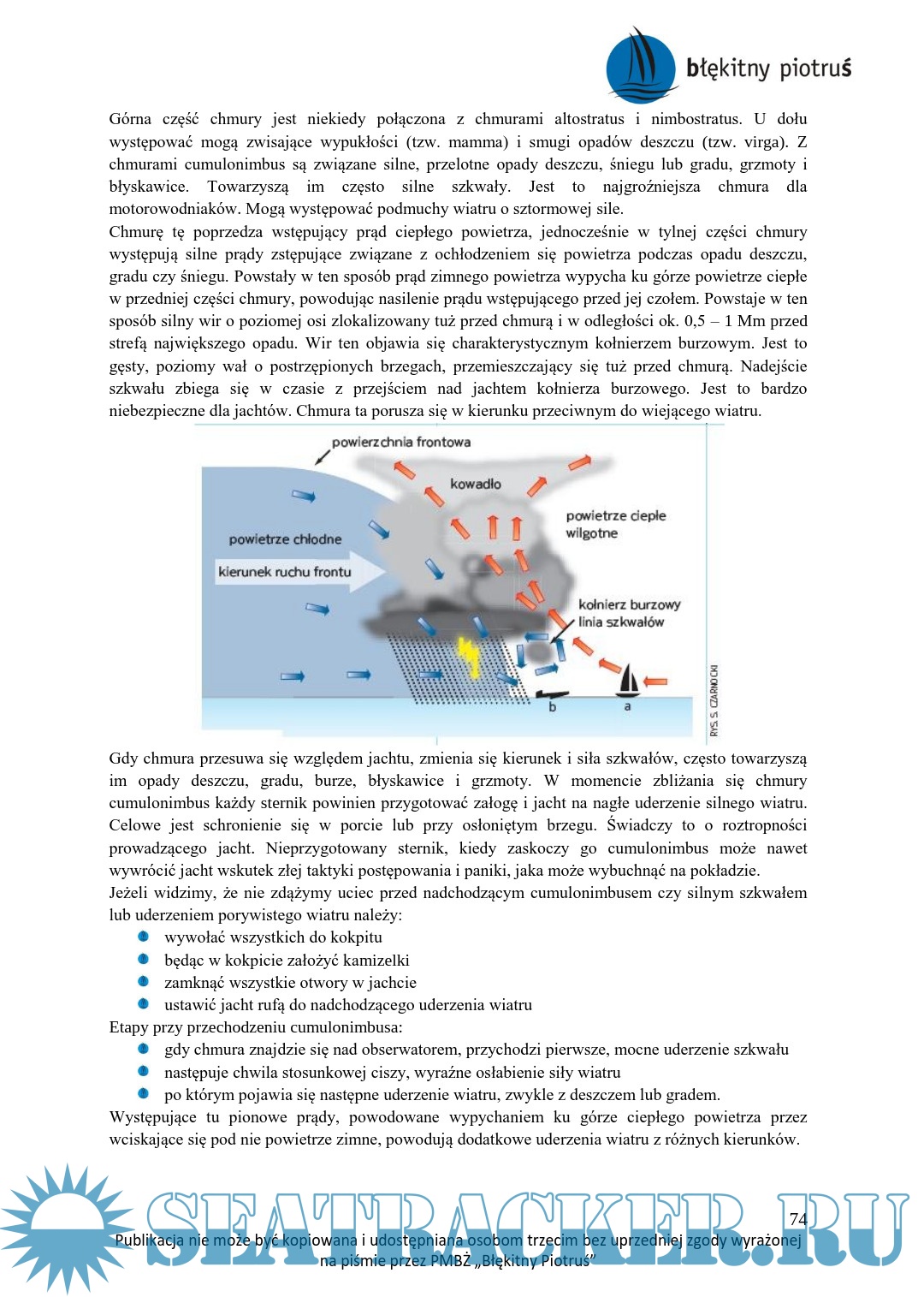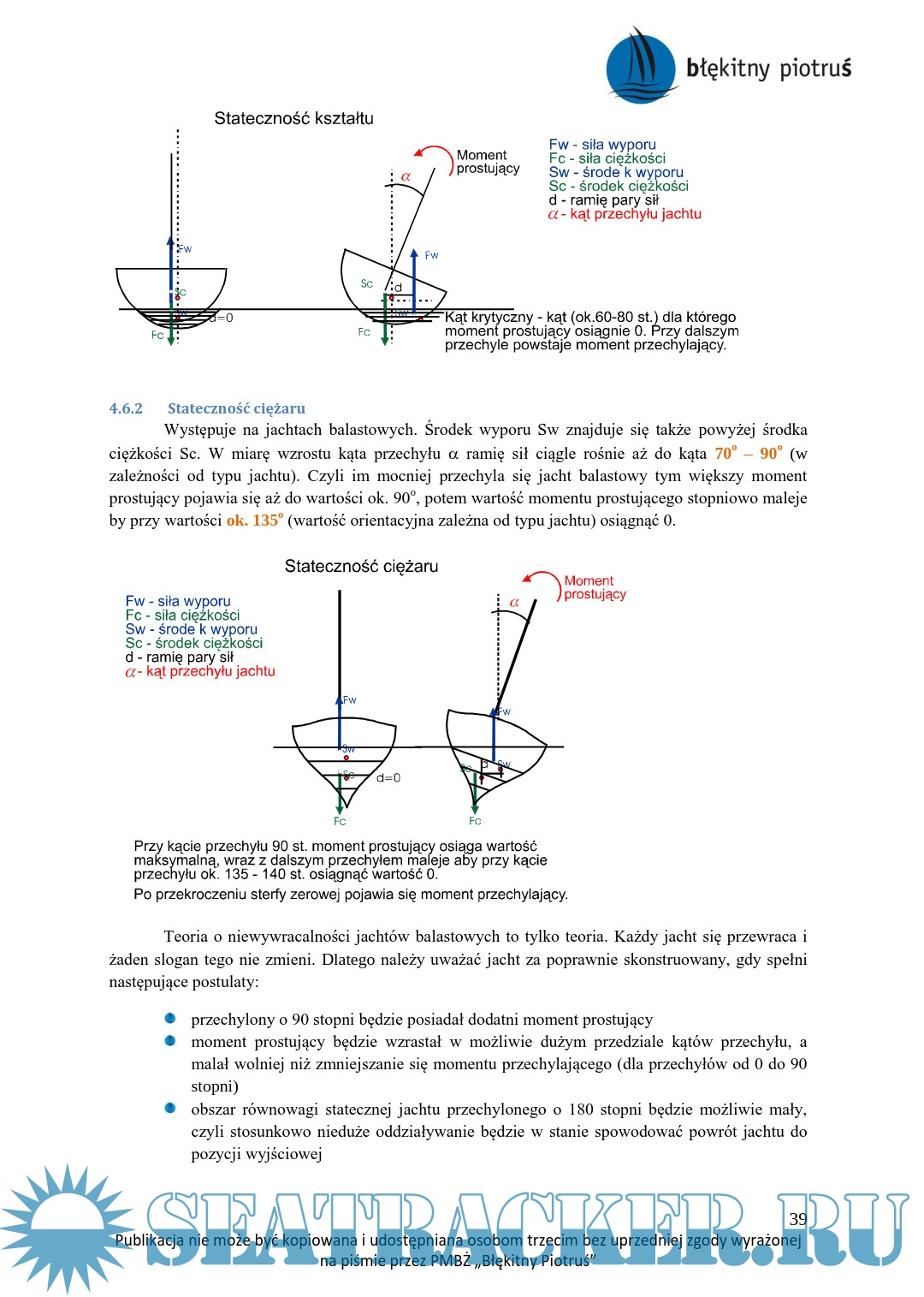 Wiadomości ogólne. Obowiązujące państwowe patenty żeglarskie. Rejestracja łodzi żaglowych. Budowa jachtów żaglowych – podstawy. Jacht – podstawowe pojęcia. Kadłub jachtu. Budowa kadłuba drewnianego. Rodzaje dziobów i ruf. Osprzęt jachtu żaglowego. Omasztowanie. Olinowanie. Elementy ożaglowania. Drobny osprzęt żaglowy. Drobny osprzęt pokładowy. Liny pomocnicze. Urządzenie sterowe. Rodzaje kotwic. Instalacje na jachcie. Kategorie projektowe. Silniki i urządzenia napędowe. Silniki dwusuwowe. Silniki czterosuwowe. Jak prawidłowo uruchomić silnik zaburtowy? Postępowanie z silnikiem zamoczonym. Eksploatacja i przeglądy. Śruby napędowe. Teoria żeglowania. Pojęcia podstawowe. Wiatr. Kursy względem wiatru. Halsy. Burty. Odpadanie i ostrzenie. Siły działające na jacht w ruchu. Siła aerodynamiczna. Siła hydrodynamiczna. Zrównoważenie żaglowe jachtu. Nawietrzność. Zawietrzność. Praca żagli. Zasada ustawienia żagli. Poprawienie sprawności aerodynamicznej – współpraca żagli. Działanie steru. Siła naporu mas wody. Stateczność jachtu – zapobieganie wywrotkom. Stateczność kształtu. Stateczność ciężaru. Pływalność jachtu. Żeglowanie w trudnych warunkach pogodowych. Podstawy locji. Drogi wodne i budowle hydrotechniczne. Znaki żeglugowe i oznakowanie dróg wodnych. Szlak żeglowny i jego oznakowanie. System IALA. Pomoce nawigacyjne. Mapy i przewodniki. Podstawowe przepisy prawa drogi na morskich i śródlądowych drogach wodnych. Prawo drogi. Na początek kilka definicji. Ogólnie przyjęte zasady prawa drogi. Zasady obowiązujące pomiędzy małymi statkami. Wyprzedzanie. Podsumowanie. Sygnalizacja wzrokowa statków. Sygnały dźwiękowe. Znaki żeglugowe. Wiadomości z zakresu ratownictwa wodnego. Podstawowe informacje o morskich służbach ratowniczych. Wyposażenie jachtu w środki bezpieczeństwa i posługiwanie się nimi. Działania w przypadku wywrotki jachtu. Działania w przypadku awarii własnego jachtu. Działania w przypadku wypadku. Postępowanie w sytuacji „człowiek za burtą”. Udzielanie pierwszej pomocy. Hipotermia oraz pierwsza pomoc w przypadku hipotermii. Wiadomości z zakresu meteorologii. Ochrona wód przed zanieczyszczaniem. Załączniki. Oświetlenie i oznakowanie statków. Znaki informacyjne. Znaki nakazu. Znaki zakazu. Znaki ograniczenia. Znaki zalecenia.