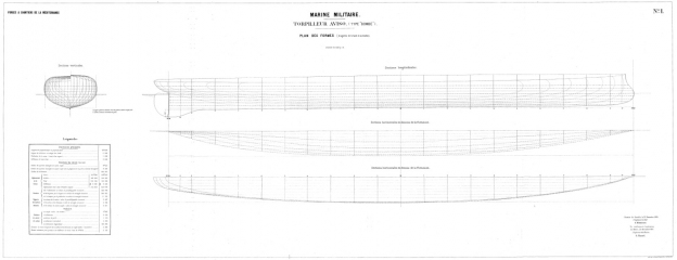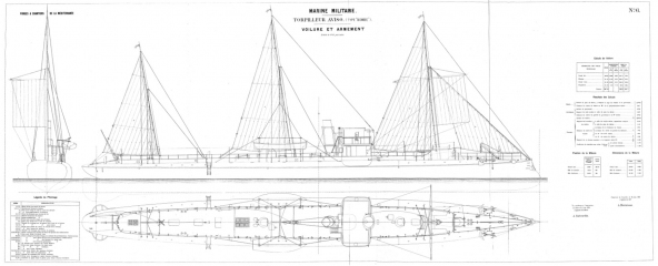 Описание: 14 листов архивных чертежей французского миноносца LANCE 1886 год