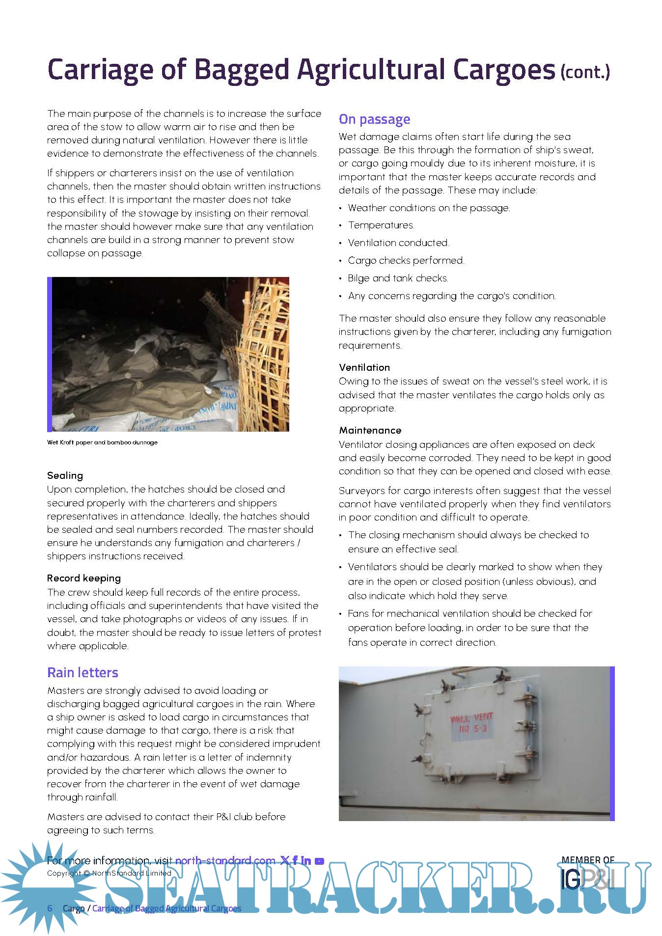 Year: 2025 Language: English Author: NorthStandard Genre: Other Edition: 22 January 2025 Format: PDF Quality: eBook Pages count: 10 Description: Briefing on Carriage of Bagged Agricultural Cargoes. Agricultural cargoes include crops and commodities such as wheat, rice, oilseeds and nuts. One of the largest exported agricultural cargoes shipped globally in bags is rice. Agricultural cargoes are hygroscopic, meaning that they have a moisture content that can interact with the air. If the air in the cargo hold has high relative humidity in comparison with the moisture content of the cargo, then the cargo will absorb moisture from the air. Conversely, if the air has low relative humidity in comparison to the moisture content of the cargo, then the cargo will release moisture to the air. This briefing serves to assist members with the carriage of bagged hygroscopic cargoes by discussing the various risks associated with them. Understanding these risks will allow members to employ best practice both operationally and pre-fixture to avoid the risk of claims.