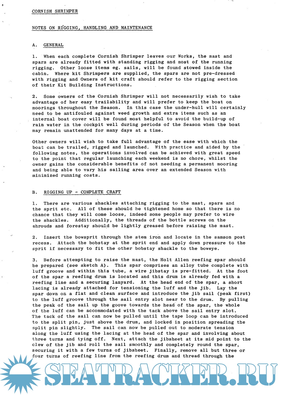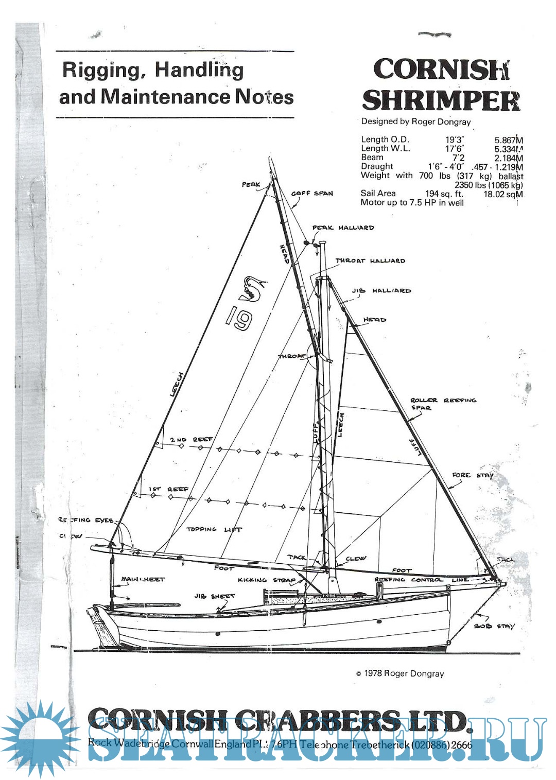 Year: 1978 Language: English Author: Dongray R. Genre: Manual Publisher: CORNISH CRABBERS LTD Format: PDF Quality: eBook Pages count: 23 Description: Before rigging and sailing the Coble for the first time, it is worth the owner having a look around the boat generally to understand the concept of the design and its “built-in facilities. Under the huli the central keel running from the stem, which develops into twin skegs aft, is brass bound to prevent damage when beaching and drying out. The twin aft skegs help to ensure that the Coble remains upright when aground.
