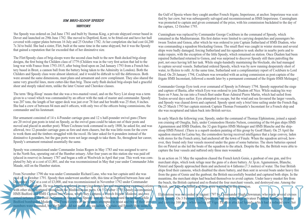Description: The Speedy was ordered on 2nd June 1781 and built by Thomas King, a private shipyard owner based in Dover and launched on 29th June 1782. She moved to Deptford, Kent, to be fitted-out and have her hull covered with copper plates between 16 July and 25 October 1782. At her completion she had cost £4,200