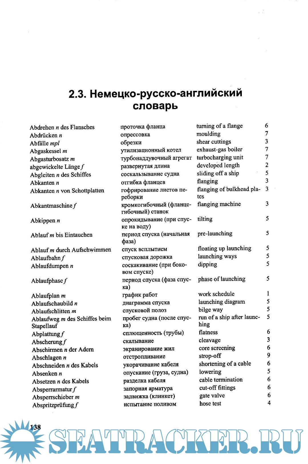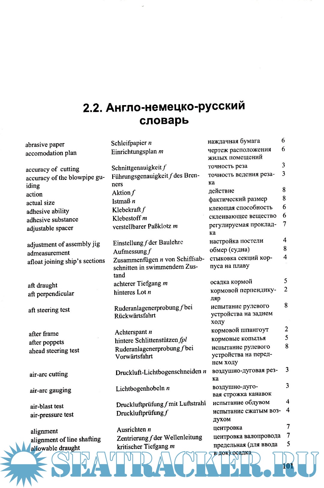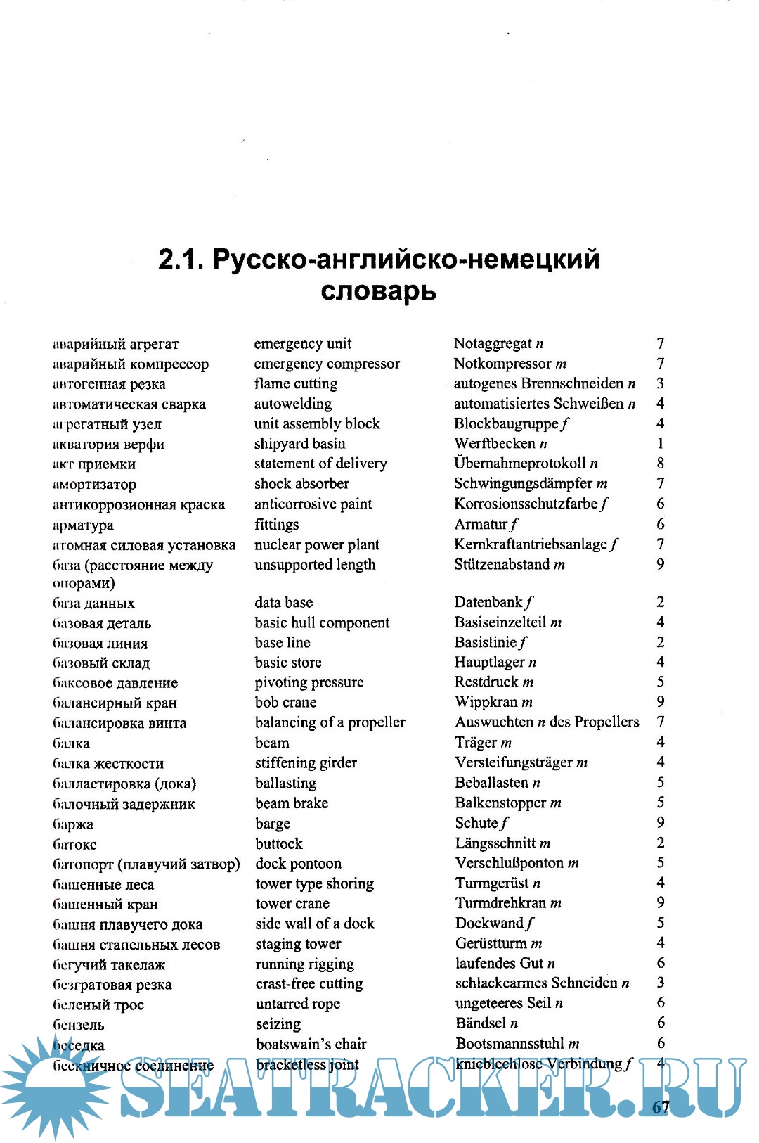Description: The dictionary, which unites about 1600 terms used in shipyard practice, includes two main sections. The first of them is built according to the "Russian-English-German" placement scheme. Within it, the presented terms are grouped into nine special topics. The second section contains three combined dictionary blocks, within which the same terms are built according to the schemes: Russian-English-German, English-German-Russian and German-Russian-English dictionaries.