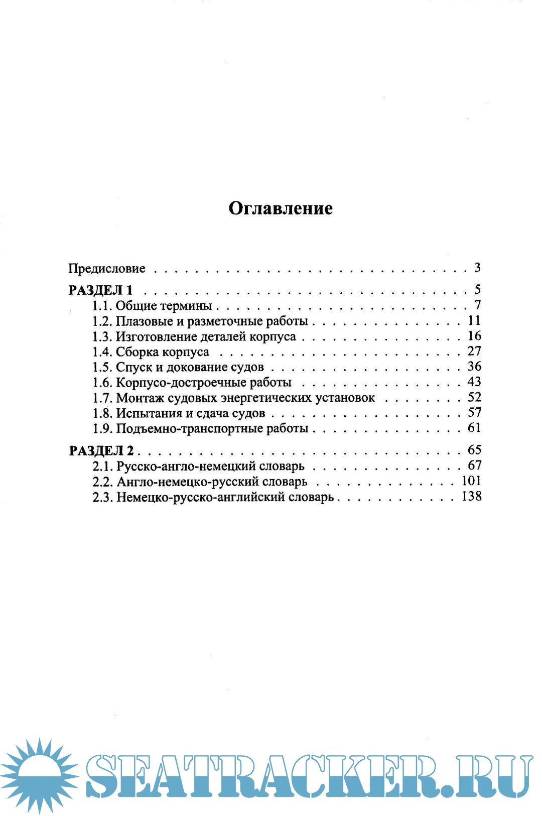 Словарь, объединяющий около 1600 терминов, используемых в практике работы судоверфей, включает в себя два основных раздела. Первый из них построен по 'русско-англо-немецкой' схеме размещения. В его пределах представляемые термины сгруппированы по девяти специальным темам. Второй раздел содержит три объединенных словарных блока, в пределах которых те же термины выстроены по схемам: русско-англо-немецкий, англо-немецко-русский и немецко-рксско-английский словари.