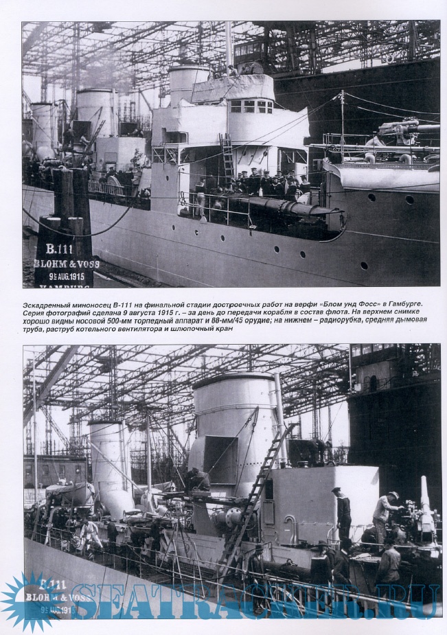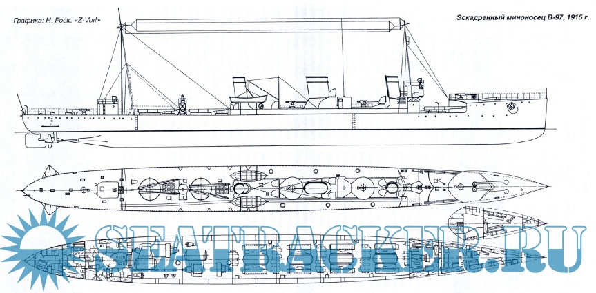 К началу Первой мировой войны, в которой Россия и Германия оказались в разных воюющих лагерях, ни один из машинокомплектов, находившихся в высокой степени готовности, не был поставлен заказчику. В первых числах августа 1914 года руководство фирм “Блом унд Фосс” и “Вулкан” обратилось в Имперское военно-морское управление (Reichmarineamt - RMA) с предложением построить по два больших миноносца на основе имевшихся готовых деталей корпусов и механизмов, заказанных им русским флотом. Они должны были иметь нормальное водоизмещение 1350 тонн, скорость 36 узлов и вооружаться четырьмя 88-мм пушками и шестью 500-мм торпедными аппаратами.