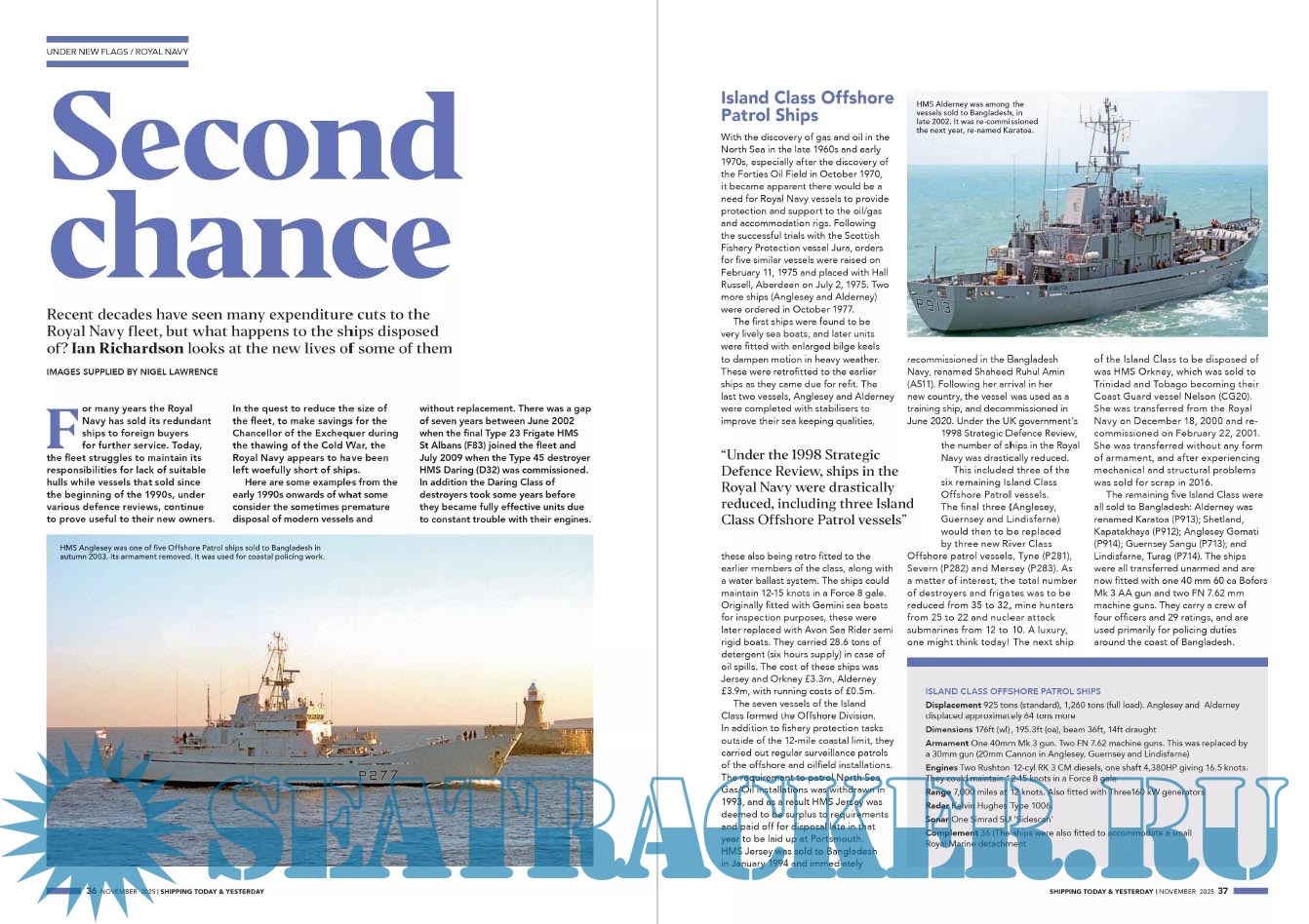 Description: Warships IFR puts the spotlight on the latest developments in the world’s navies. It covers current defence issues and has comments by leading analysts. The magazine regularly includes features on the Royal Navy and the US Navy in addition to incorporating news and features on all other navies across the globe. Warships IFR frequently carries in-depth articles on naval heritage.WARSHIPS International Fleet Review is published 12 times a year by Tandy Media Ltd who also publish Shipping Today & Yesterday (which provides news and features from the world of merchant shipping).