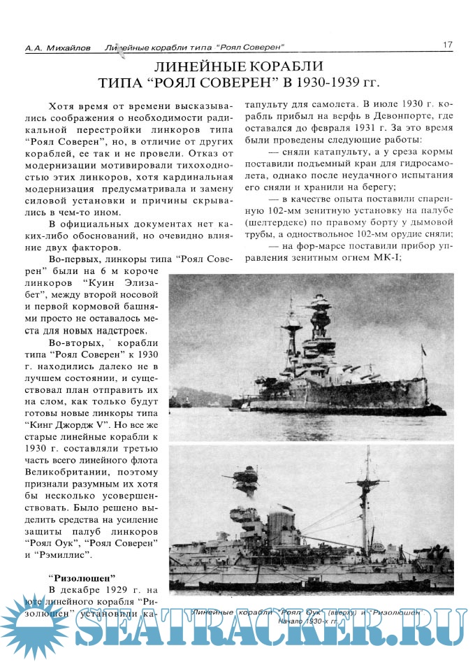 В книге описаны: Проектирование и постройка, участие в Первой Мировой войне, модернизация в 1922-1930 гг., Линейные корабли типа "Роял Соверен" в 1930-1939 гг., модернизации в период Второй Мировой войны, участие во Второй Мировой войне. Большое количество схем, чертежей, фото.
