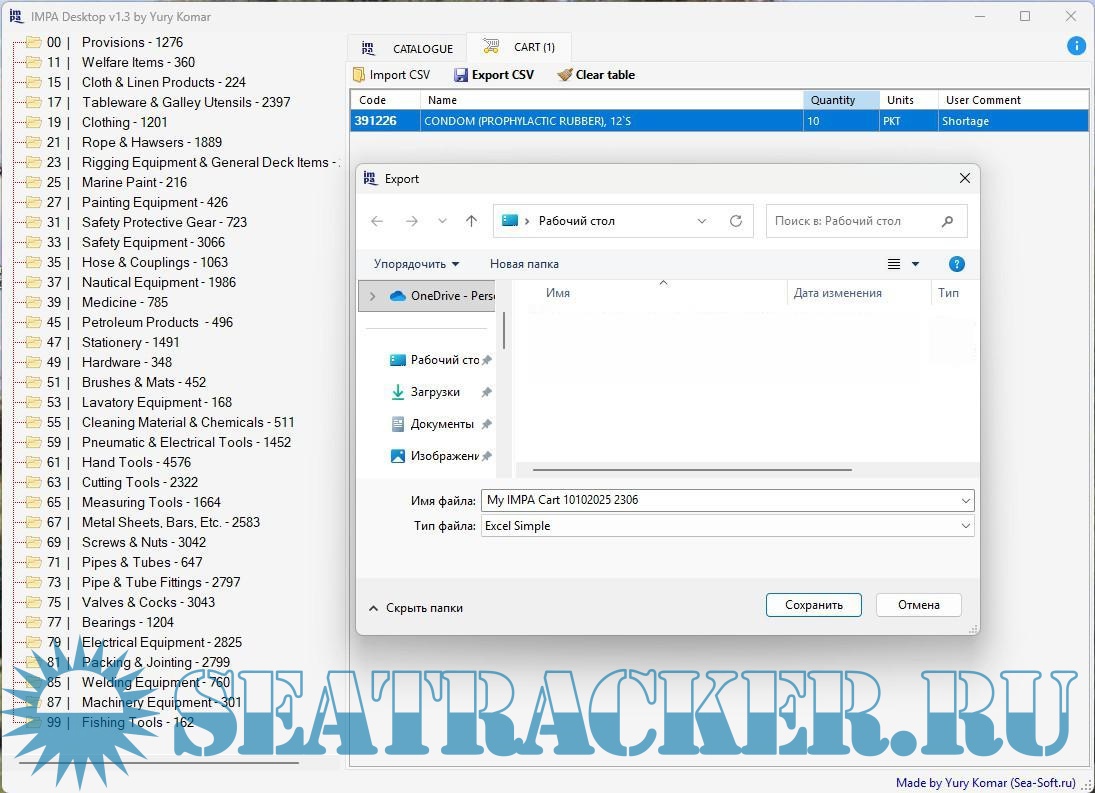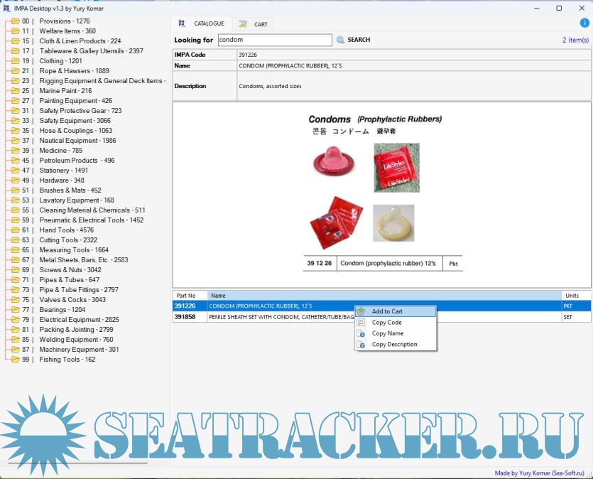 Year: 2025 Version: 1.3 Developer: Yury Komar Telegram Platform: Windows System Requirements: - Windows 7/8/10/11 - .NET Framework 4.8 - MS Visual C++2010 Localization: English Crack: Not needed Description: An offline version of IMPA Catalogue for Windows. Portable, lightweight and fast. Search engine trying to find your portion of text in catalogue by codes, names and descriptions in seconds, very fast, so that you are not required to waste long time while searching something for your marine orders using hard-copy paper books of the same catalogue on board. Papers are in the past.!!! • Import of Cart from CSV • Add User Comments for items you adding to the Cart • Ability to edit your comment right in the Cart's table • Cross-platform! Now you can export/import your cart to CSV and continue editing on any Android(by Mikhail Mishabar)/Windows(by Yury Komar) device! Additional info: Try IMPA Finder (By Mikhail Mishabar)(for Android):https://www.rustore.ru/catalog/...ud.impacatalogue Please support the project:http://sea-soft.ru/donate.html If any application from Sea-Soft Project has helped you with routine job or simplifying any other tasks, consider supporting its continued development with a small donation! ???? Application requires VC++ 2010 version. Included in the torrent. Can be also download from here https://t.me/SeaSoft_by_YuryKomar/3856/3947 Any donations large or small are greatly appreciated :) Donate : EUR via Telegram Any via Boosty RUB via Sber Made with ❤ in Vladivostok.