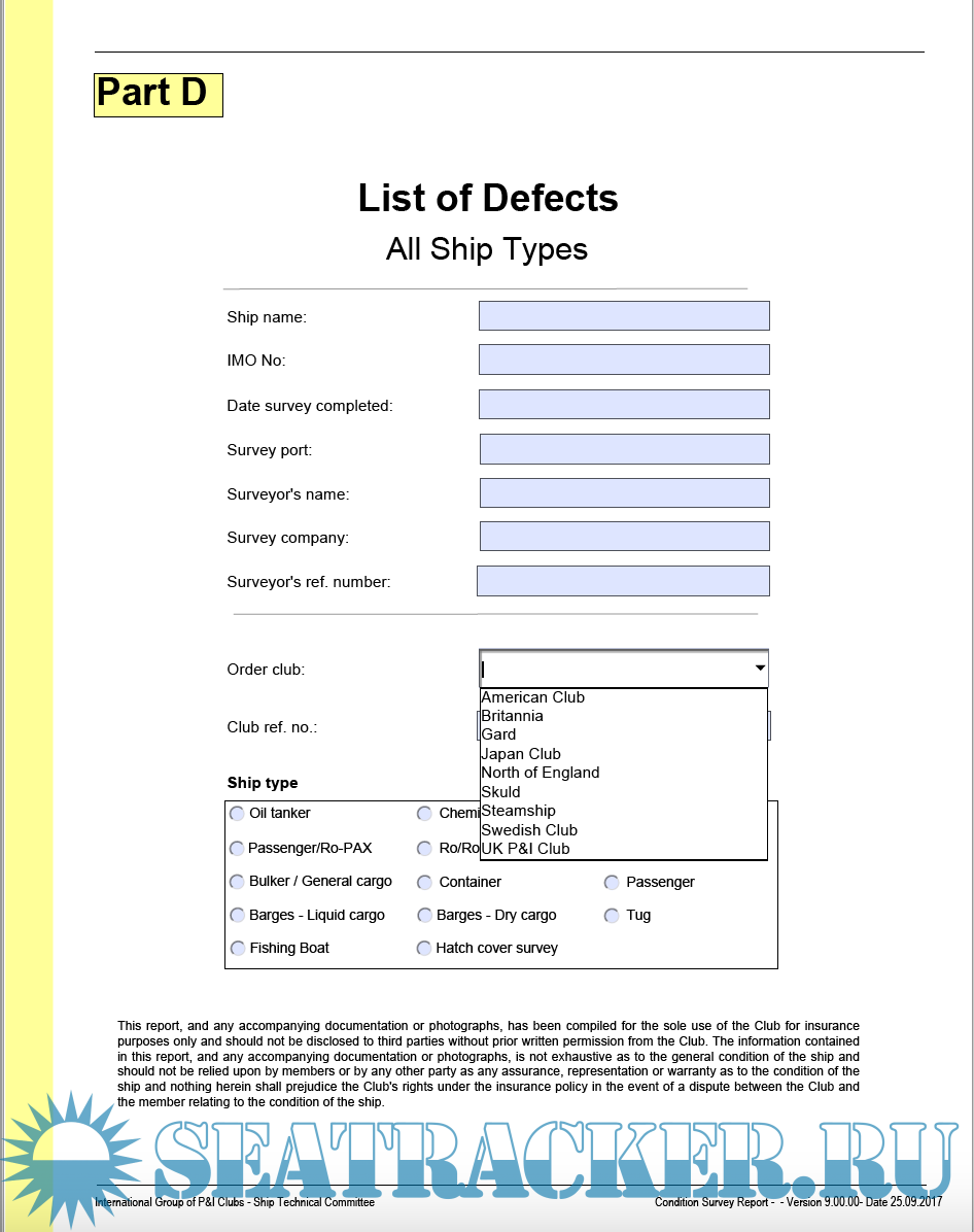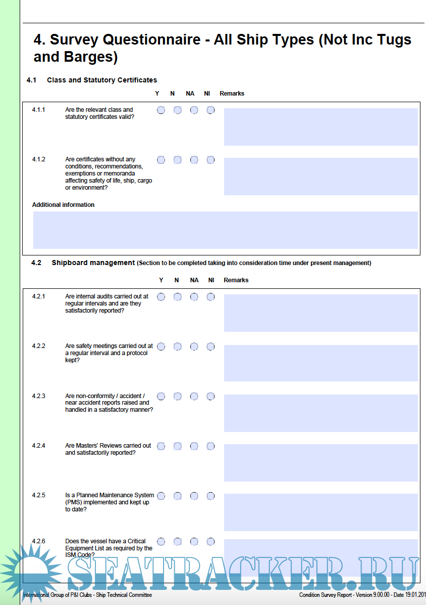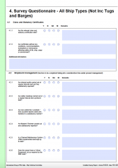 -IG SHIP CONDITION SURVEY QUESTIONNAIRE PART C – REEFER SHIP IG SHIP CONDITION SURVEY REPORT FORM – PART A – ALL SHIP TYPES IG SHIP CONDITION SURVEY QUESTIONNAIRE – PART B – ALL SHIP TYPES IG SHIP CONDITION SURVEY QUESTIONNAIRE – PART C BARGES – DRY CARGO BULK IG SHIP CONDITION SURVEY QUESTIONNAIRE – PART C BARGES – LIQUID CARGO IG SHIP CONDITION SURVEY QUESTIONNAIRE – PART C – BULK, GENERAL CARGO AND OTHER IG SHIP CONDITION SURVEY QUESTIONNAIRE – PART C – CHEMICAL TANKER IG SHIP CONDITION SURVEY QUESTIONNAIRE – PART C – CONTAINER SHIP IG SHIP CONDITION SURVEY QUESTIONNAIRE – PART C – FISHING IG SHIP CONDITION SURVEY QUESTIONNAIRE – PART C – GAS TANKER IG SHIP CONDITION SURVEY QUESTIONNAIRE – PART C – HATCH COVERS – MULTI COVERS IG SHIP CONDITION SURVEY QUESTIONNAIRE PART C – OIL TANKER IG SHIP CONDITION SURVEY QUESTIONNAIRE PART C – PASSENGER RO-PAX IG SHIP CONDITION SURVEY QUESTIONNAIRE PART C – PASSENGE IG SHIP CONDITION SURVEY QUESTIONNAIRE PART C – RO RO IG SHIP CONDITION SURVEY QUESTIONNAIRE PART C – TUGS IG SHIP CONDITION SURVEY QUESTIONNAIRE PART D – DEFECT LIST FOR ALL SHIPS