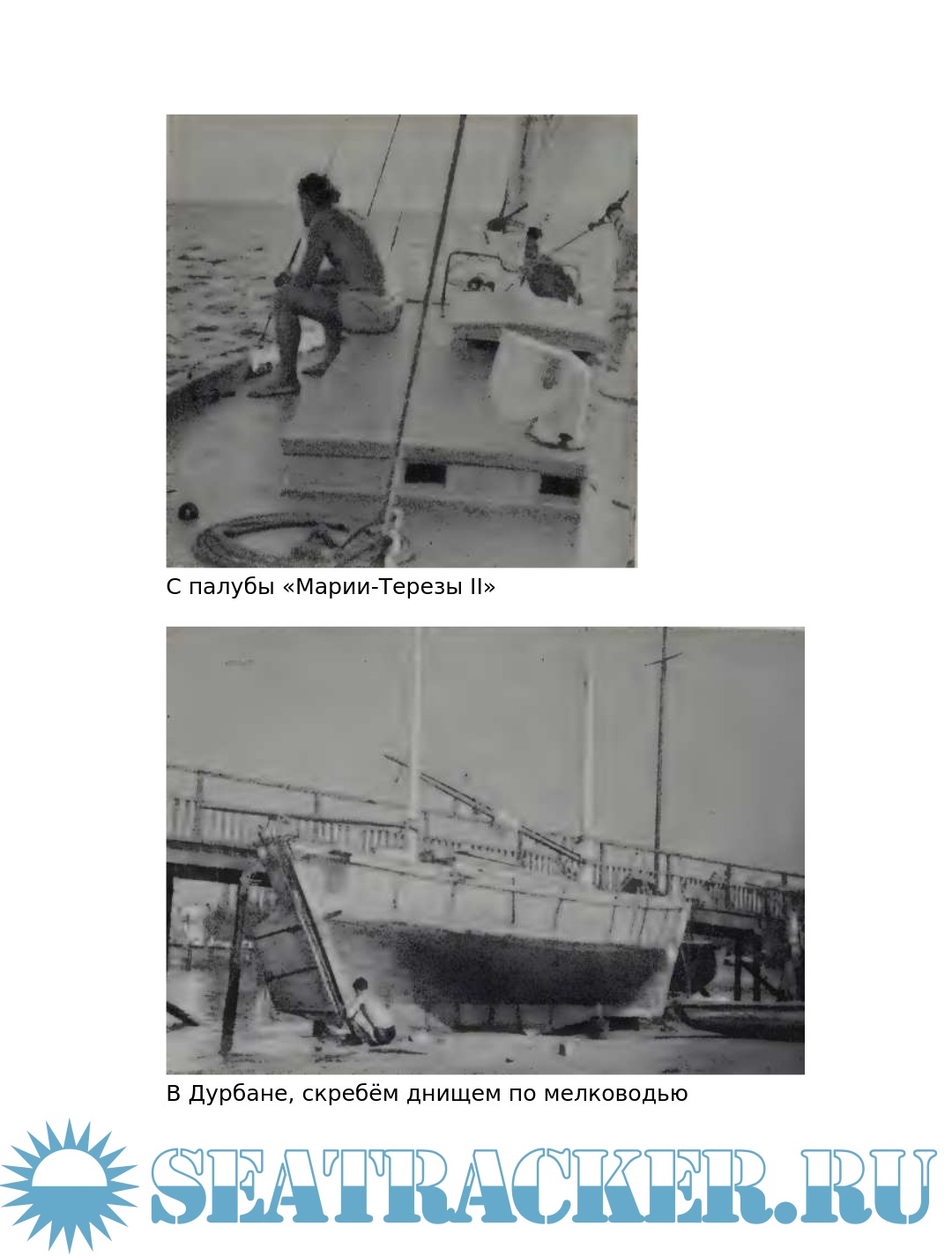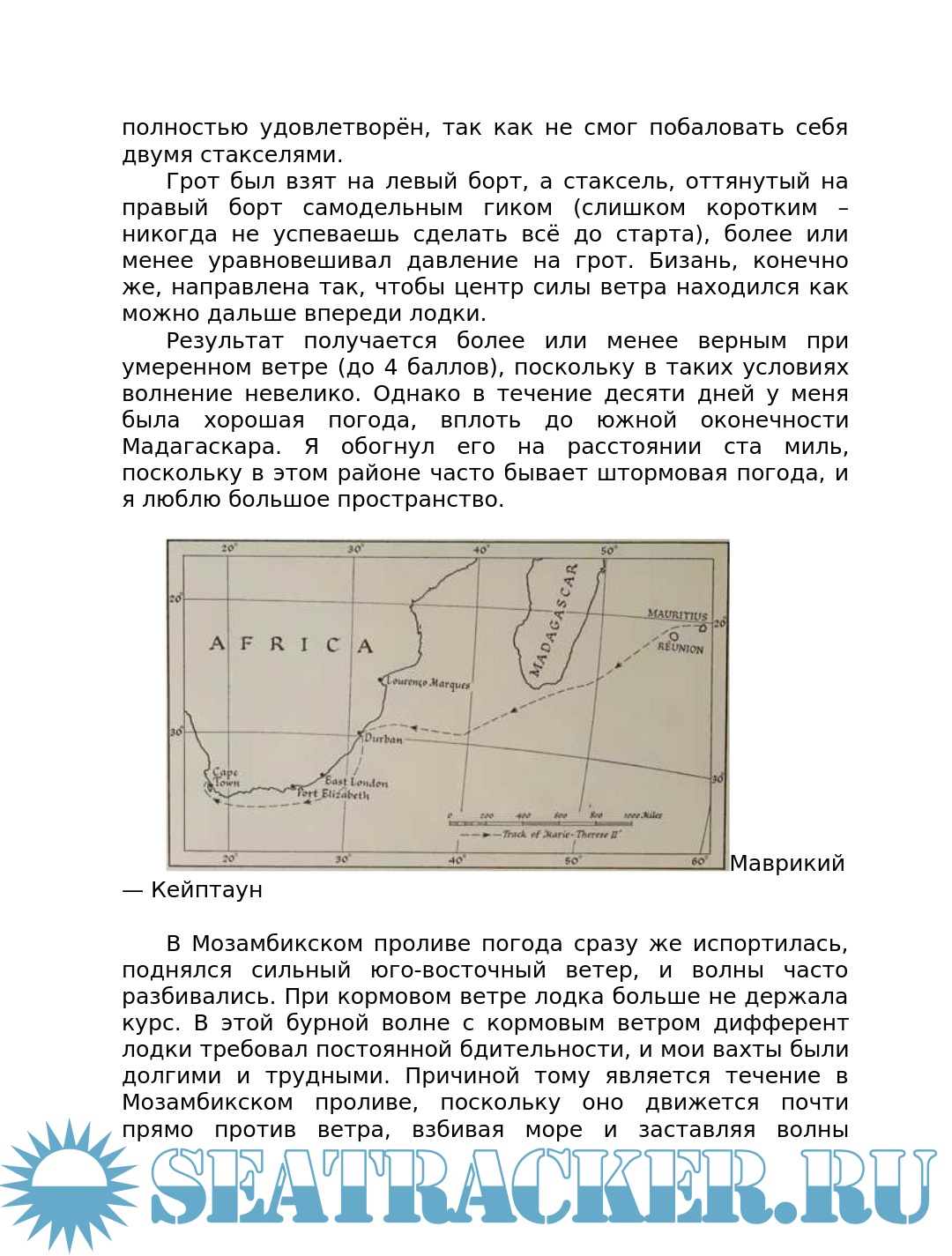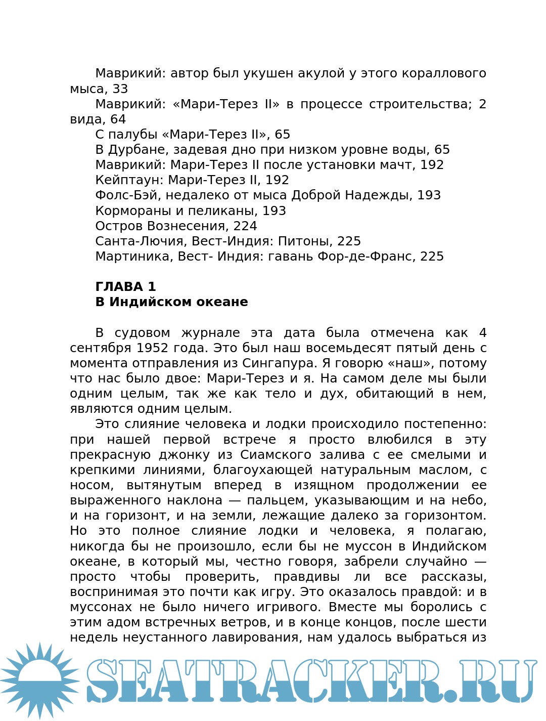 Год выпуска: 1971 Язык: Русский Автор: Муатесье Б. Жанр: История Издательство: 1971 ISBN: 0 370 01307 7 Формат: PDF, ePUB Качество: Изначально компьютерное (eBook) Количество страниц: 326 Описание: Перевод любительский. - С оригинала: Sailing to the Reefs. London: Hollis & Carter Ltd. 1971. – 288 p. + index. С иллюстрациями. Бернар Муатесье (Bernard Moitessier )(1925 — 1994) — французский яхтсмен , наиболее известный своим участием в гонке Sunday Times Golden Globe Race 1968 года , первой безостановочной одиночной кругосветной яхтенной гонке. Это его первая книга, французское название «Un Vagabond des mers du sud» Flammarion 1960, в ней описывается его одиночное плавание (1952-1957 г.г.) на парусной лодке «Мари Тереза» из Индокитая к о. Диего-Гарсия и после крушения, о постройке новой лодки «Мари Тереза II» на Маврикии и продолжении плавания через Южную Африку, о. Святой Елены, о. Вознесения к Карибским островам, где снова произошло крушение на рифах.