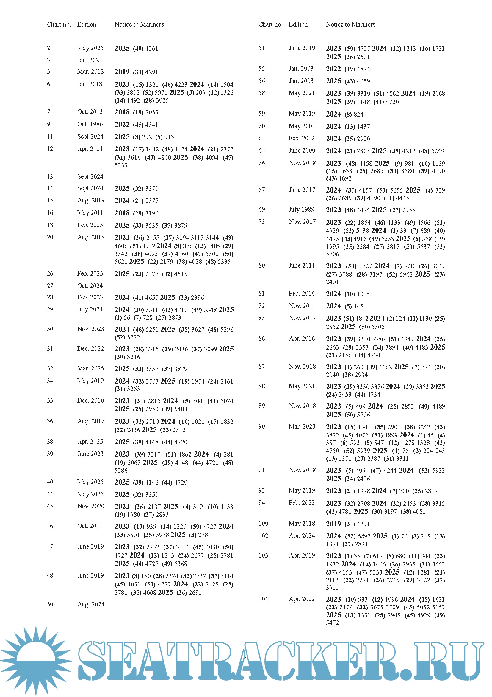 The Cumulative List of ADMIRALTY Notices to Mariners (NP234 A/B) can help you to identify outstanding NMs and audit trails for a particular chart or charts. The list is published annually, with Part A in January and Part B in July.