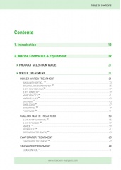 The catalogue presents a comprehensive range of products designed for vessel operation, maintenance, and environmental protection. It includes marine chemicals, water treatment solutions, cleaning and maintenance products, protective coatings, refrigerant gases, testing equipment, and spill response solutions. The publication provides detailed product specifications and application guidance aimed at improving operational efficiency, safety, and compliance with international maritime regulations.