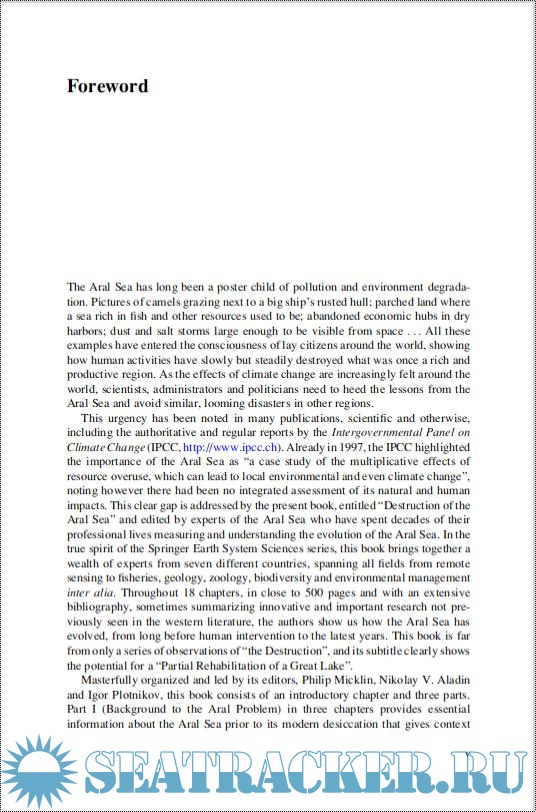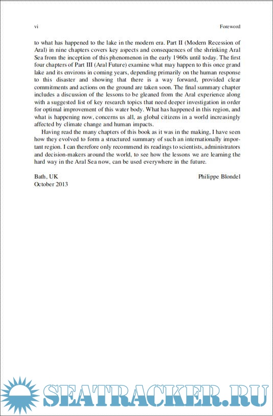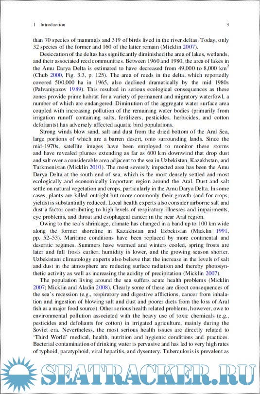 Year: 2014 Language: English Author: Philip Micklin, N.V. Aladin, Igor Plotnikov Publisher: Springer-Verlag ISBN: ISBN 978-3-642-02356-9 Format: PDF Quality: eBook Pages count: 30 Description: Recommended reading to see how the lessons we are learning the hard way in the Aral Sea now, can be used everywhere in the future. Until the 1960s, the Aral Sea was the world's fourth-largest inland lake, covering approximately 68,000 km2. Fed by the Amu Darya and Syr Darya rivers, it was a thriving saline ecosystem supporting a major fishing industry. It has since shrunk by over 90% into a toxic desert. This book, masterfully organized and led by its editors, Philip Micklin, Nikolay V. Aladin and Igor Plotnikov, covers key aspects and consequences of the shrinking Aral Sea from the inception of this phenomenon in the early 1960s until today. This book consists of an introductory chapter and three parts. Part I (Background to the Aral Problem) in three chapters provides essential information about the Aral Sea prior to its modern desiccation that gives context to what has happened to the lake in the modern era. Part II (Modern Recession of Aral) in nine chapters covers key aspects and consequences of the shrinking Aral Sea from the inception of this phenomenon in the early 1960s until today. The first four chapters of Part III (Aral Future) examine what may happen to this once grand lake and its environs in coming years, depending primarily on the human response to this disaster and showing that there is a way forward, provided clear commitments and actions on the ground are taken soon. The final summary chapter includes a discussion of the lessons to be gleaned from the Aral experience along with a suggested list of key research topics that need deeper investigation in order for optimal improvement of this water body. What has happened in this region, and what is happening now, concerns us all, as global citizens in a world increasingly affected by climate change and human impacts.