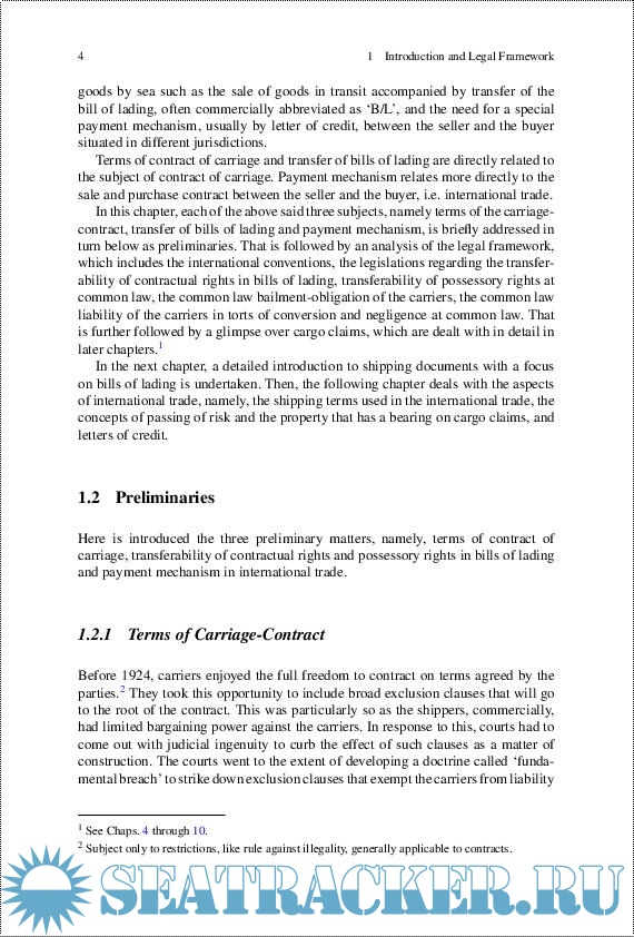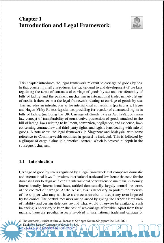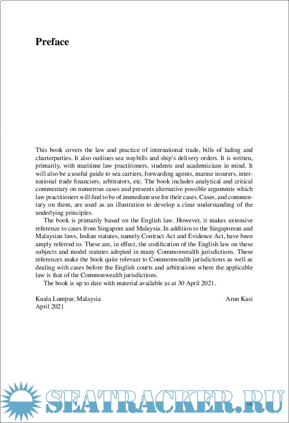 Year: 2021 Language: English Author: Arun Kasi Publisher: Springer-Verlag Edition: 1st ISBN: 978-9813367951 Format: PDF Quality: eBook Pages count: 580 Description: This book, written in three parts, introduces the reader to the basics of the international trade and elaborates on bills of lading and charterparties in depth. While the book is based on the English law, cases and materials from other jurisdictions, particularly Singapore, Malaysia, India, the USA, and Australia are brought in to provide an international perspective. The practical analyses, commentary and critiques of cases would be a useful guide for practitioners in developing case arguments. Although written with practitioners, academicians and students in mind, the book will also serve as a useful guide for sea carriers, freight forwarders, international traders, financiers, etc. as the complex subject is presented in reader-friendly and easy to grasp manner.