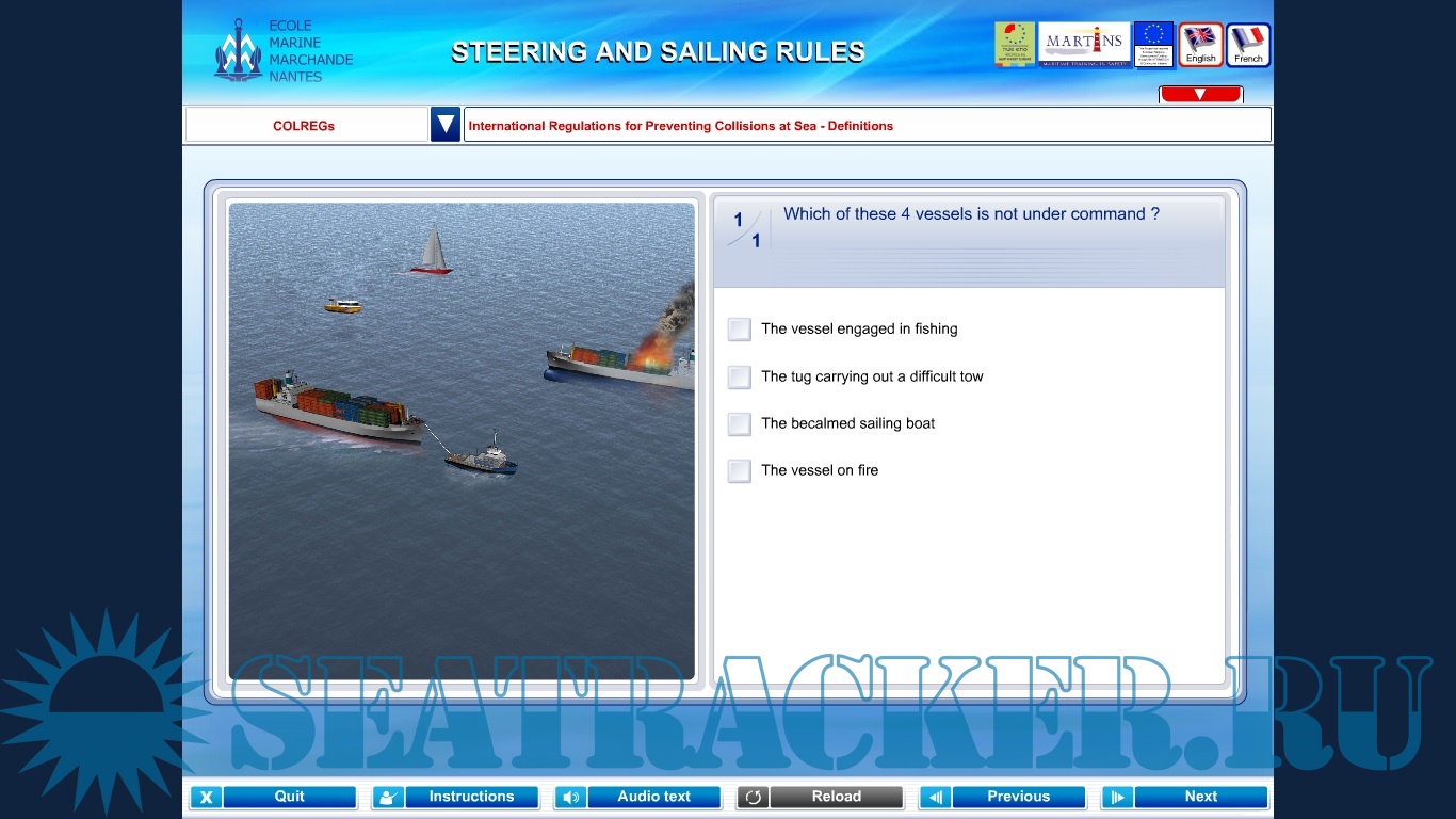 Description: This is a training program for learning of : COLREGs,Port traffic signals,IALA buoyage system and International visual storm warning signals. In COLREGs section you can find all rules represented in well made animations,sounds and description. In the end of each rule u have to answer a few questions.