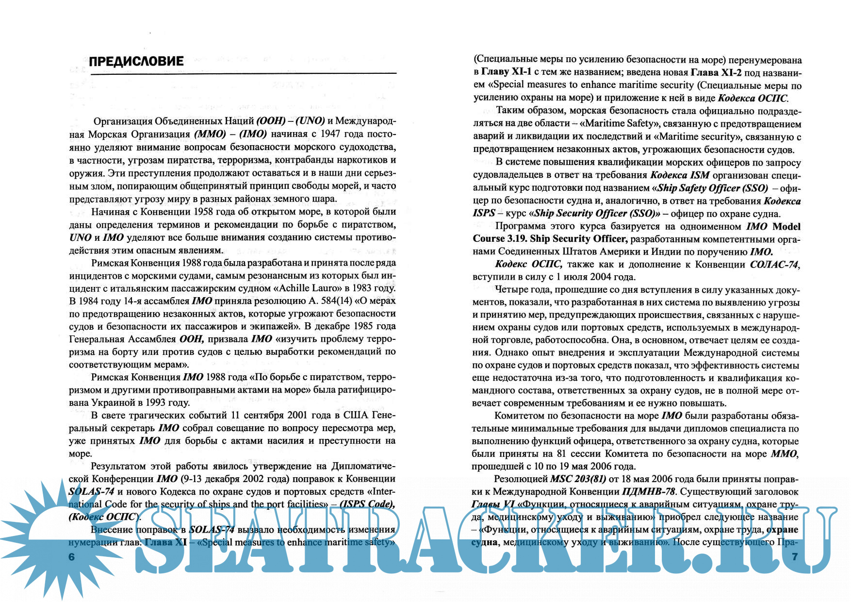 Настоящее учебное пособие подготовлено в соответствии с принятыми Дипломати¬ческой Конференцией (Лондон-IMO, 9-13 декабря 2002), рядом поправок в Международную Конвенцию СОЛАС 74, включающих обязательные требования, знание которых дает право на выдачу офицеру, прошедшему обучение на специальных курсах, диплома (сертификата) для выполнения функций, связанных с охраной судна. Спецификация минимальных стандартов профессиональных знаний, умений и навыков для офицера, ответственного за охрану судна, из¬ложена в Правиле VU5 - Конвенции ПДНМВ 78/95, а также в Конвенции СОЛАС 74 (Правиле XI -2/3) содержащей Международный кодекс по охране судов и портовых средств (МК ОСПС), «International Code for the security of ships and the port facilities» - (ISPS CODE).