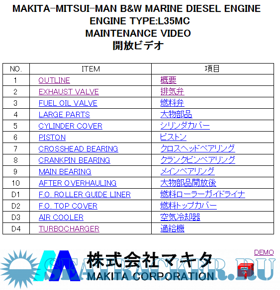 Description: Makita-Mitsui-MAN B&W Marine Diesel Engine L35MC Maintenance Videos.