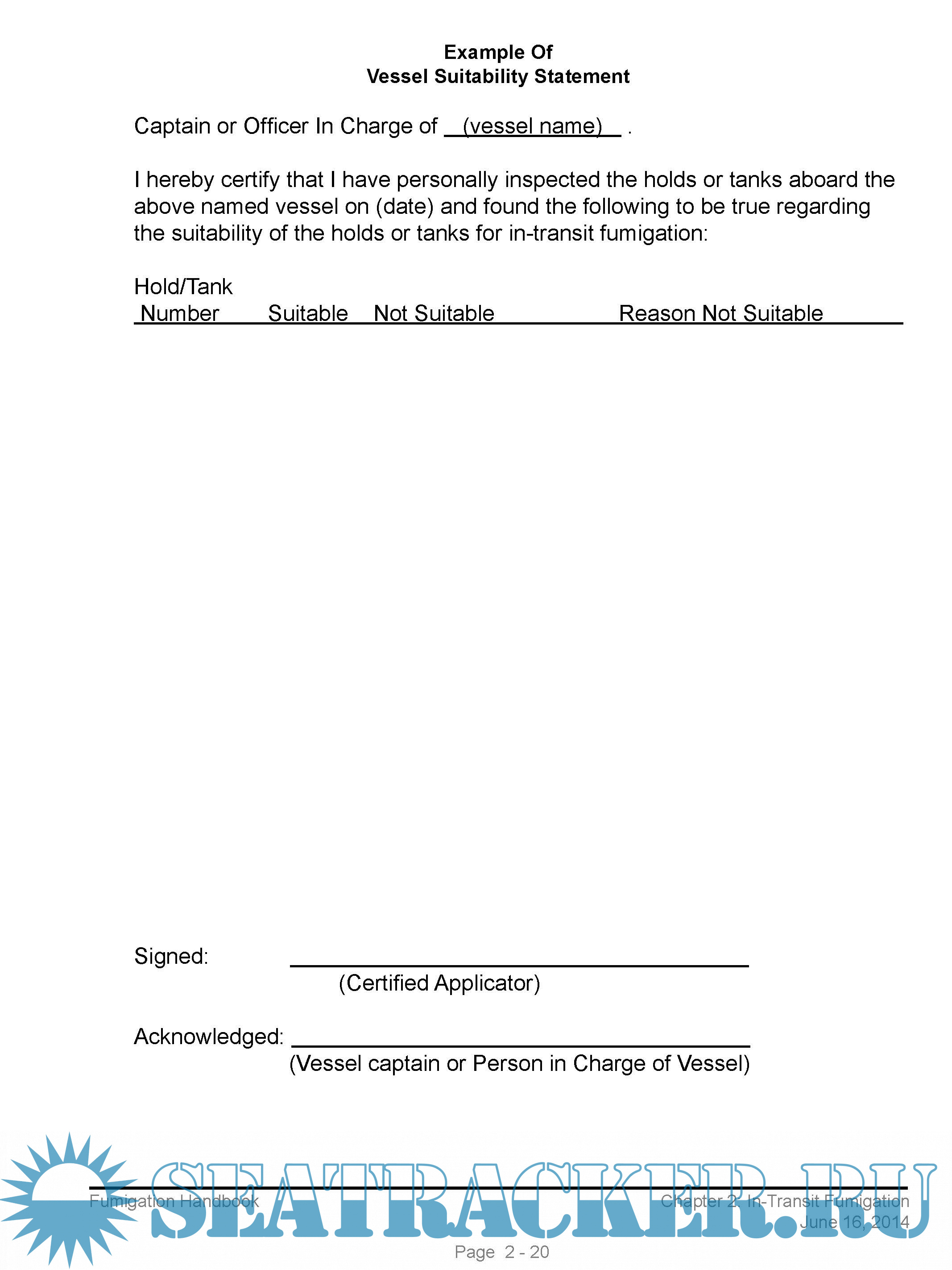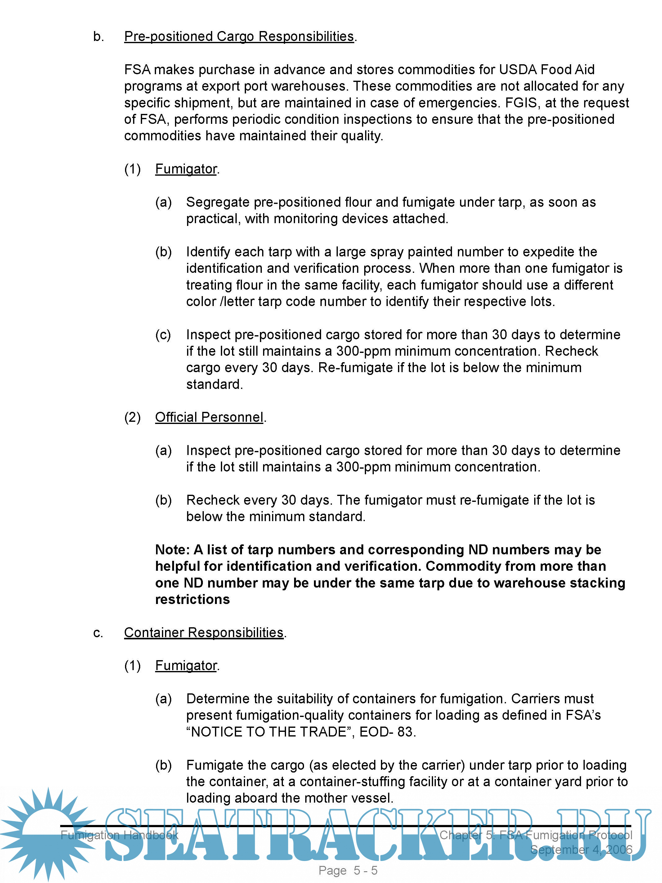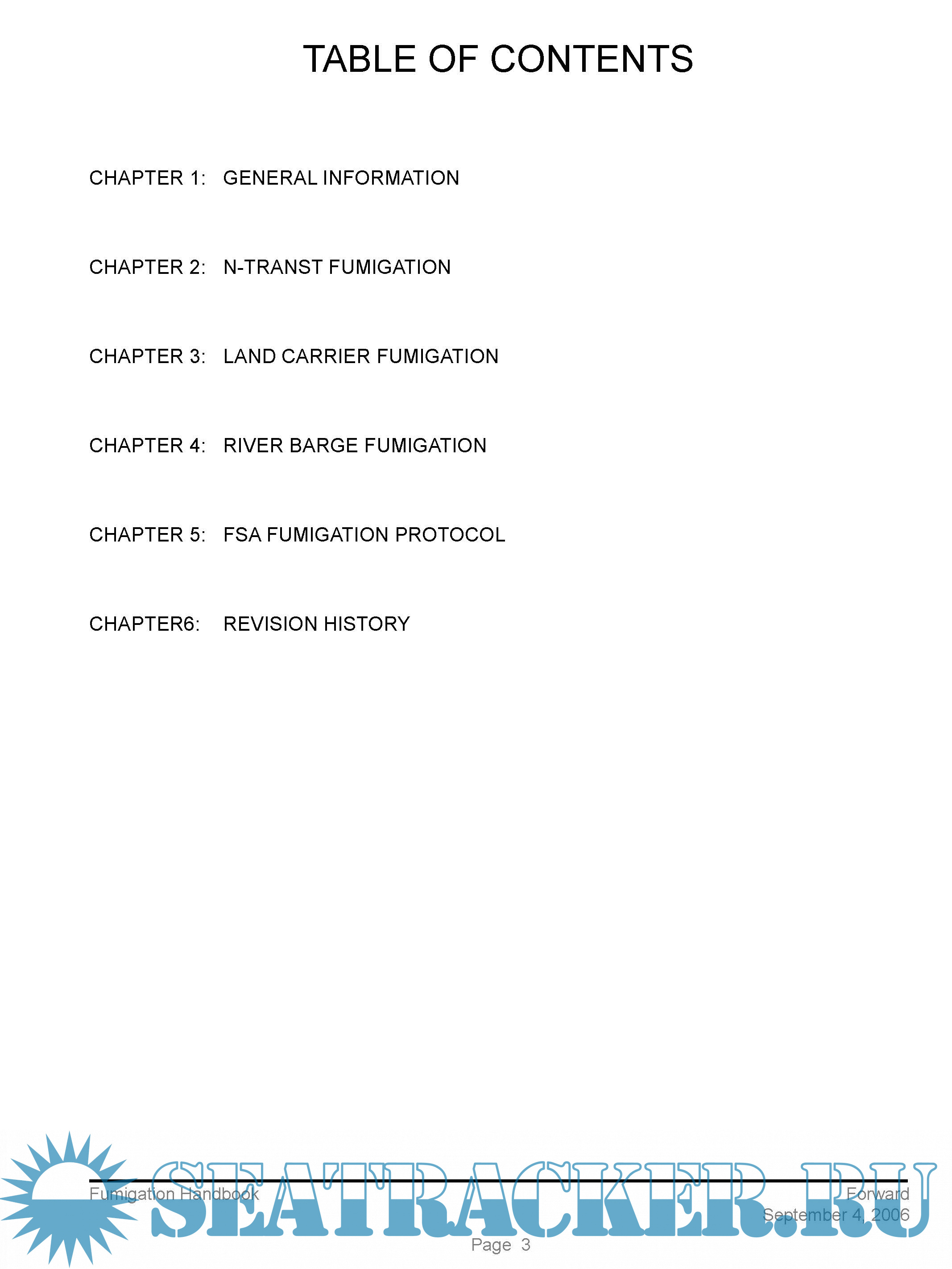 The handbook provides official inspection personnel with basic information regarding fumigants and fumigation procedures. The procedures in this handbook supersede “Fumigation Handbook”, dated September, 1987; Fumigation Handbook, Chapter 3, Land Carrier Fumigation, dated 2/27/90; Fumigation Handbook, Chapter 4, River Barge Fumigation, dated 10/28/93; FGIS-PN-97-14, “Fumigant Label Retention,” dated 5/16/97; FGIS-PN-04-11, “In-transit Fumigation of Shipholds with Separations,” dated 4/19/04; and FGIS-PN-05-02, “Short Voyage Ship Fumigation Procedures,” dated 1/07/05.