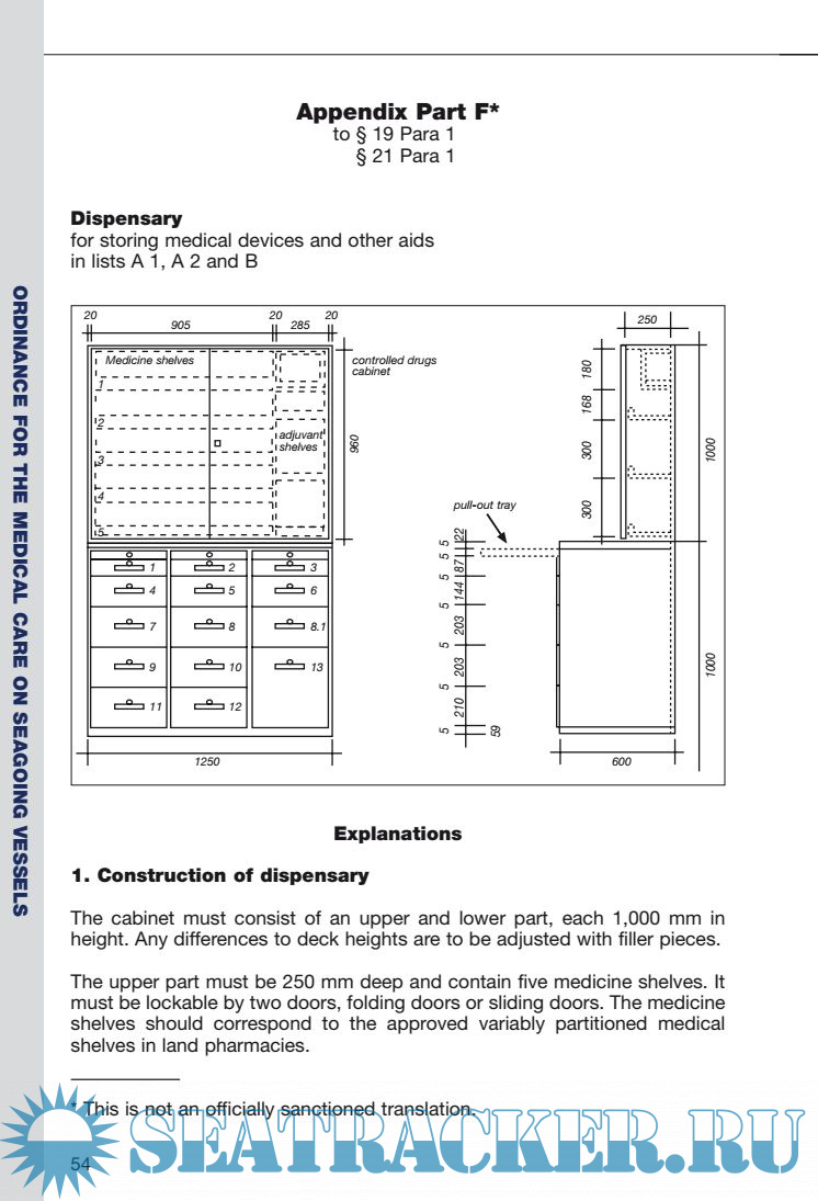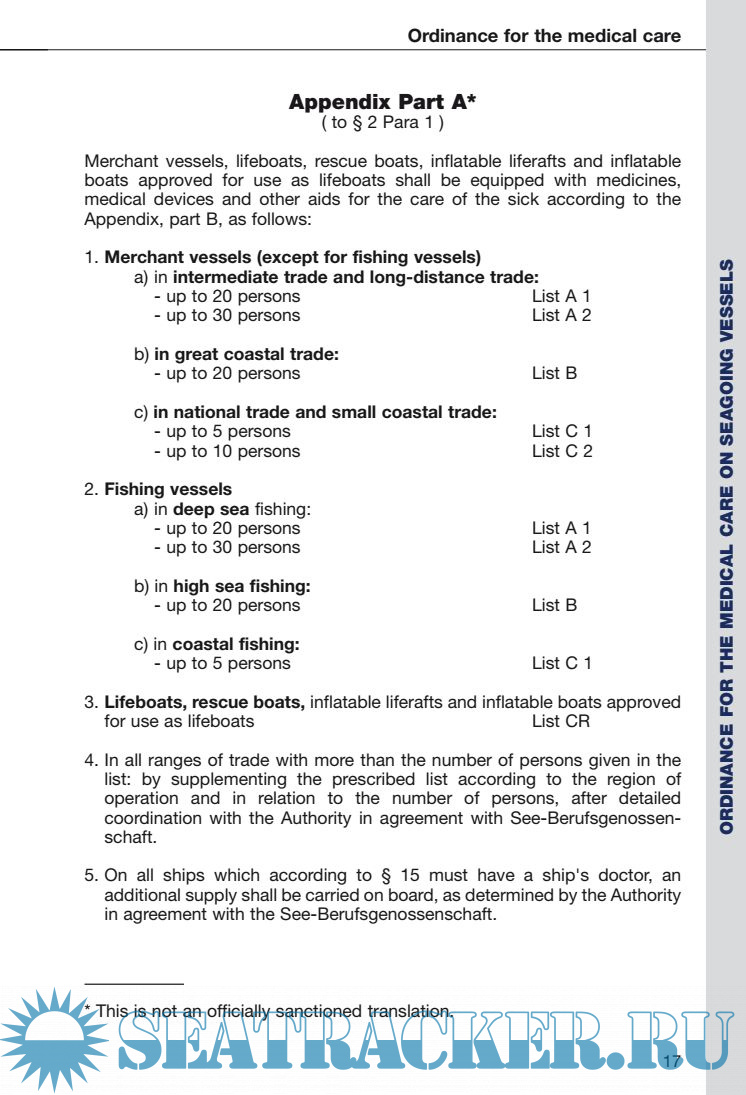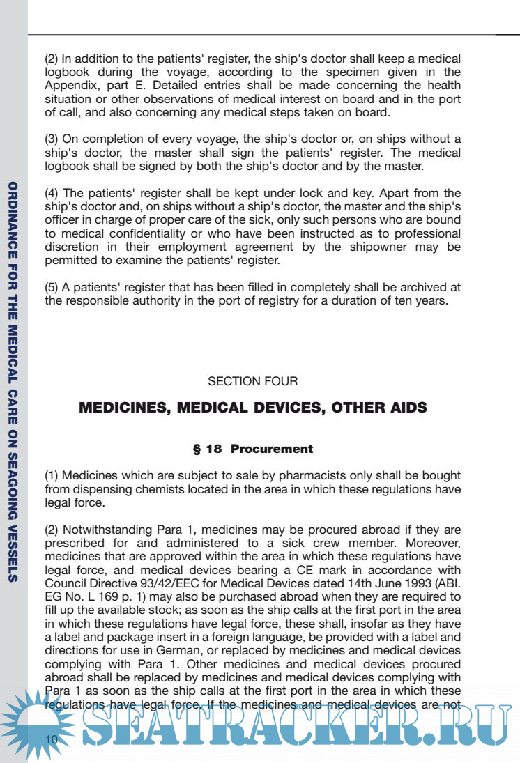 Year: 2010 Language: english Author: BGBI Genre: Convention (rules) Format: PDF Quality: eBook Pages count: 56 Description: Merchant vessels flying the German flag and their lifeboats, rescue boats, inflatable liferafts and inflatable boats approved for use as lifeboats shall be equipped with medicines, medical devices and other aids for the care of the sick in compliance with the regulations of this Ordinance and its appendices. Additional info: It is very often, that ships under German management initially was registered under German flag & law, and later have been shifted to any other flags (A&B, Cyprus e.t.c). Those ships have Officially authorized Certificate, stated possibility to fly temporary flag of other country instead of German. That means that owners keep possibility to fly German flag on short notice. That is why, that even with foreign flag, those ships need to comply with german medical standards as well. Such standards given in this Ordinance.