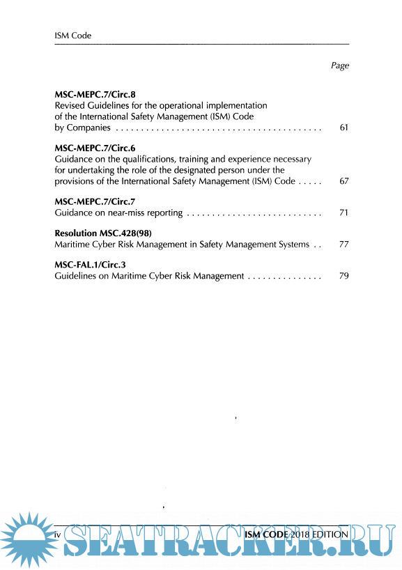 Description: The Code's origins go back to the late 1980s, when there was mounting concern about poor management standards in shipping. Investigations into accidents revealed major errors on the part of management, and in 1987 the IMO Assembly adopted resolution A.596(15), which called upon the Maritime Safety Committee to develop guidelines concerning shipboard and shore-based management to ensure the safe operation of ro-ro passenger ferries.This publication includes the texts of SOLAS chapter IX and the ISM Code. Additionally, Revised Guidelines for the operational implementation of the International Safety Management (ISM) Code by Companies (MSC-MEPC.7/Circ.8), Guidance on the qualifications, training and experience necessary for undertaking the role of the designated person under the provisions of the ISM Code (MSC-FAL.7/Circ.6), Cuidance on near-miss reporting (MSC-MEPC.7(Circ.7), Guidelines on Maritime Cyber Risk Management (MSC-FAL.7/Circ.3) and Maritime Cyber Risk Management in Safety Management Systems (resolution MSC.428(98)) are included.