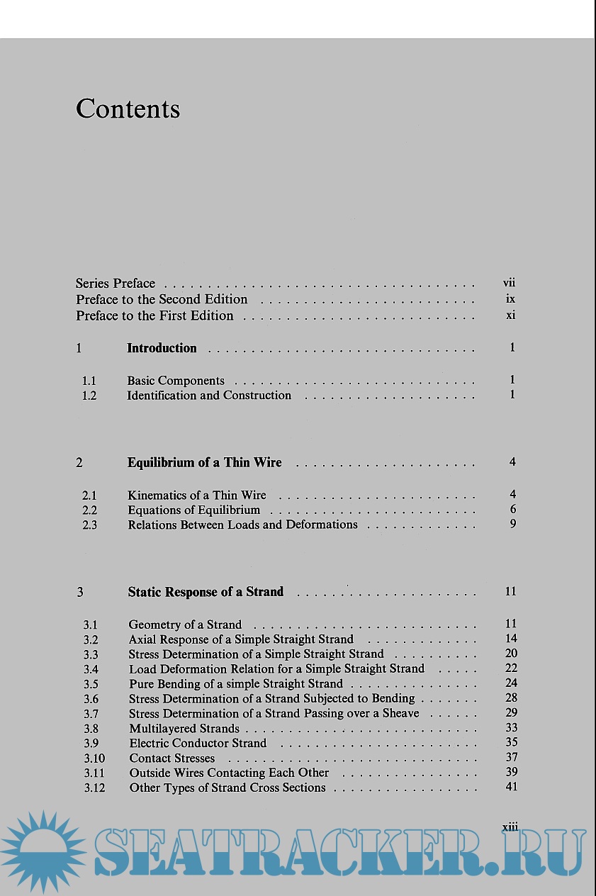 Year: 1997 Language: english Author: George A. Costello Genre: Manual Publisher: Springer Edition: 2nd ISBN: 978-1-4612-7361-5 Format: PDF Quality: eBook Pages count: 135 Description: This manual deals with the analysis of the static behavior of wire ropes under different loading conditions, and with the various theories of the fatigue. In recent years, considerable progress has been made in the development of models used to predict the response of ropes. Since there are so many parameters that can vary in the construction of a rope, such models can be used to determine the effects of possible variations of these parameters on the performance of a rope. Numerous examples are worked out to illustrate the theory, and the test results discussed. This second edition includes new chapters on tension and compression of a cord, fatigue, and assumptions and approximations used. Topics are treated with a clear language and many details of the solution steps are given; most of the cases are clarified by numerical examples. The book's aim is to be a comprehensive theoretical review of the mechanical behavior of wireropes, that can also be seen as a good handbook for those who are interested in practical design and evaluation of stresses in ropes with any geometry and cross-section.
