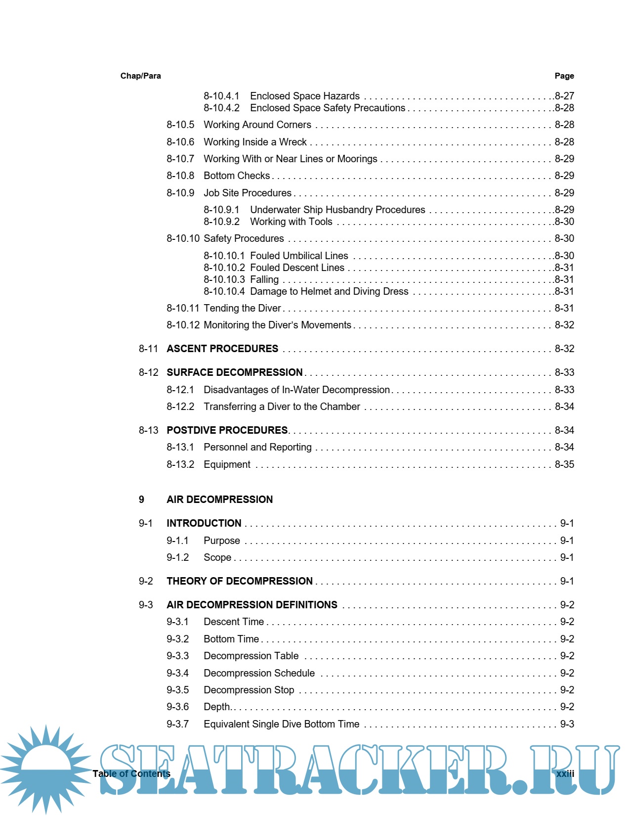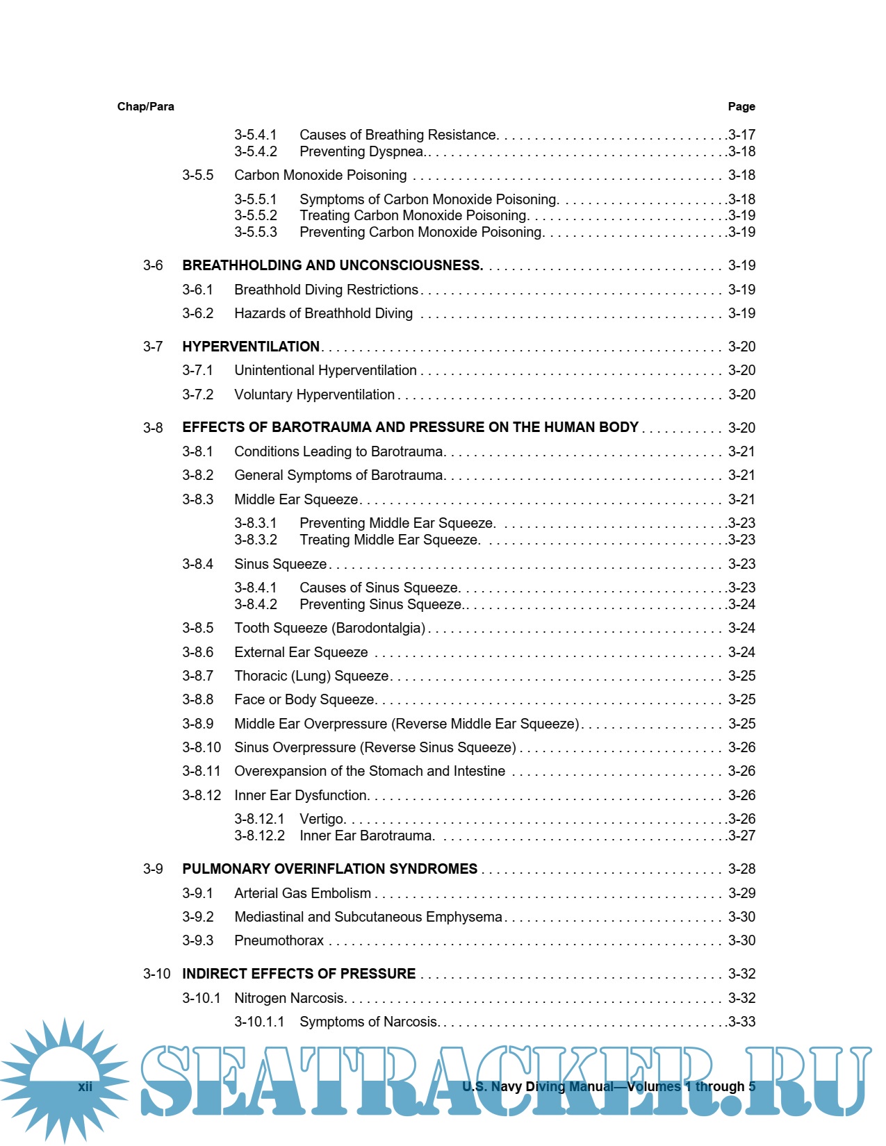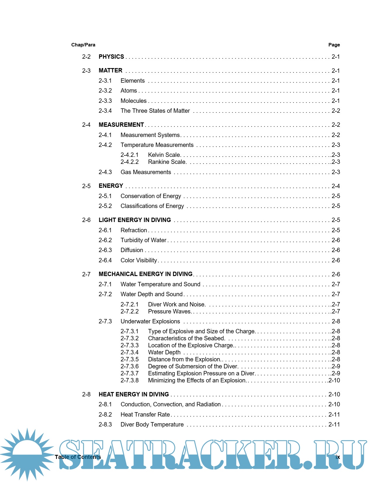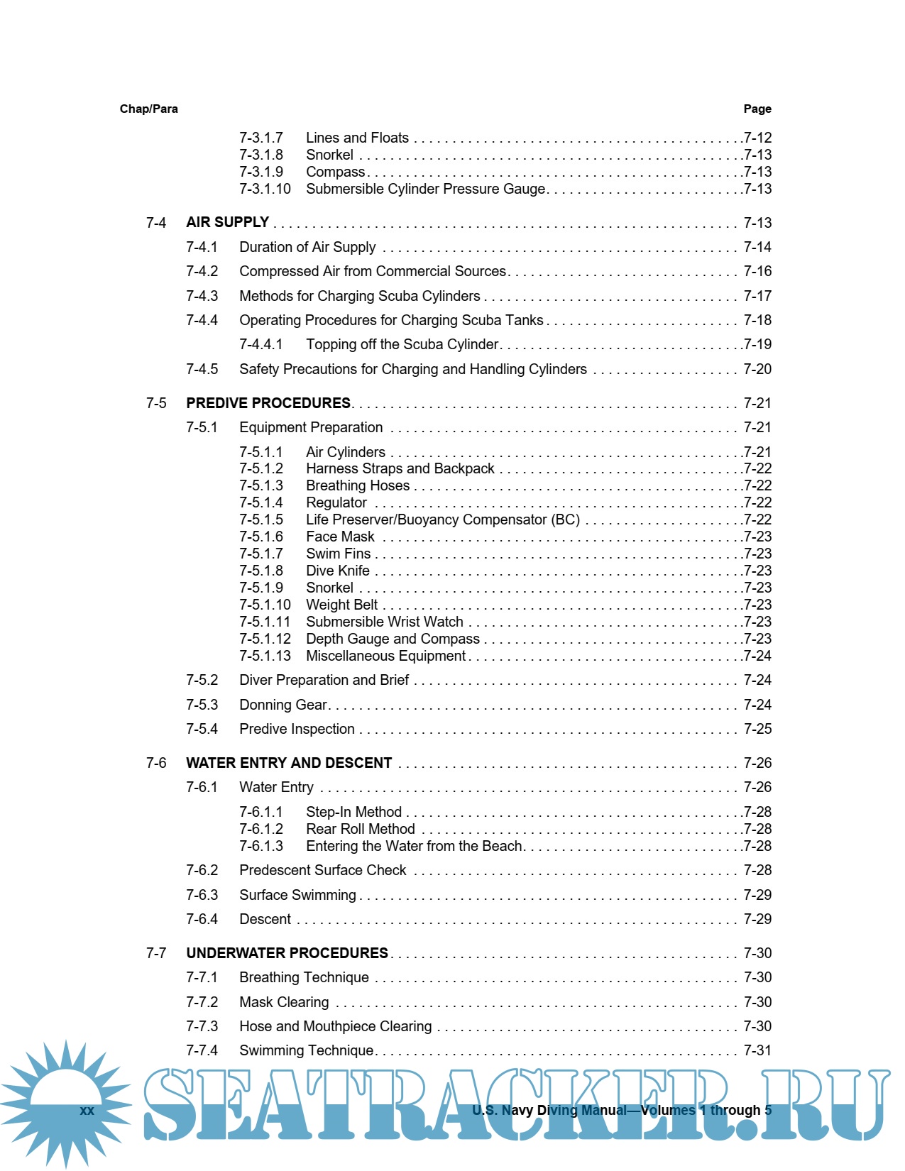 Year: 2000 Language: english Author: Department of the Army Genre: Manual Publisher: Department of the Army Format: PDF Quality: Scanned pages Pages count: 931 Description: Deep diving is underwater diving to a depth beyond the norm accepted by the associated community. In some cases this is a prescribed limit established by an authority, and in others it is associated with a level of certification or training, and it may vary depending on whether the diving is recreational, technical or commercial. Nitrogen narcosis becomes a hazard below 30 metres (98 ft) and hypoxic breathing gas is required below 60 metres (200 ft) to lessen the risk of oxygen toxicity. This edition of Field Manual (FM) 20-11 is an authorized reprint of United States (US) Navy diving manual SS521-AG-PRO-010. It examines almost all aspects of the work of military divers: from the history of diving to medical support for diving descents.