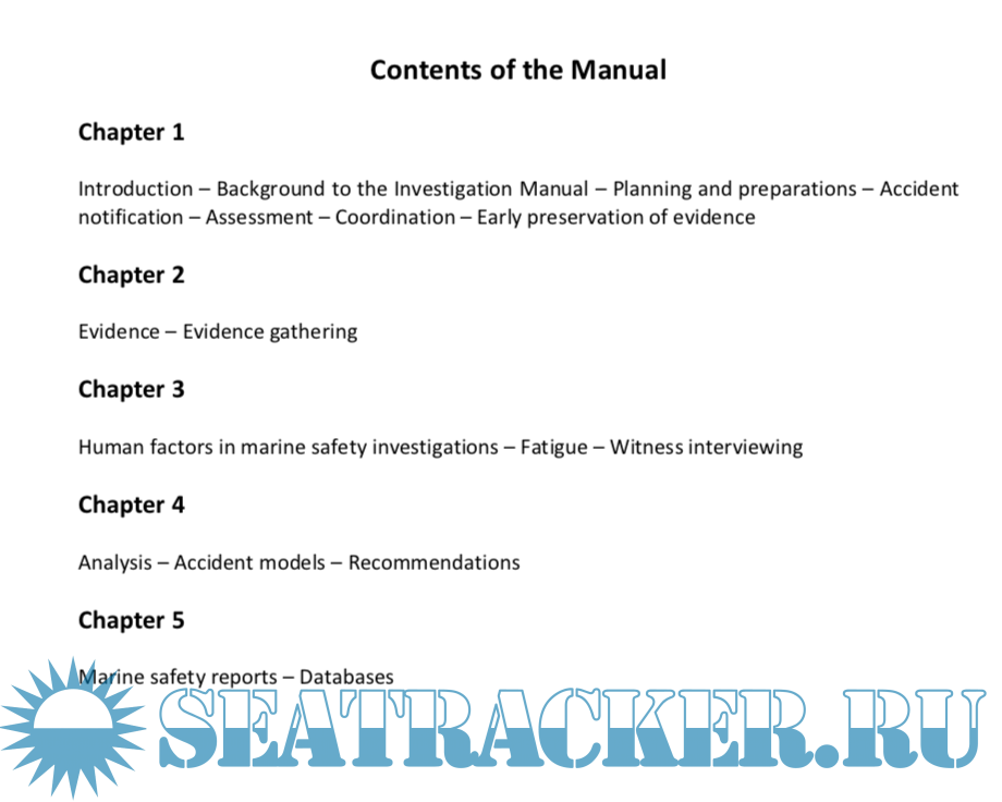 Year: 2014 Language: english Author: MAIIF Genre: Manual Publisher: MAIIF ISBN: n/a Format: PDF Quality: eBook Pages count: 173 Description: This manual is intended as support material for national marine investigation organizations which conduct investigations under the IMO Casualty Investigation Code (CI Code), which came into force on 1 January 2010. It has been collated from various sources and contains examples of industry best practice to assist investigators and investigation organizations in carrying out their roles. The intention of the manual is to build on the guidelines agreed by the IMO, to provide investigators with a basic platform from which to develop the necessary skills to carry out efficient and effective investigations, and to provide a ready reference tool. The Marine Accident Investigators’ International Forum (MAIIF) includes within its membership the chief investigators of many of the marine safety investigation organizations from around the world. One of its principal roles is to champion and promote best practice in marine safety investigation. The sole purpose of independent safety investigations into marine casualties and incidents is to improve future maritime safety and the prevention of pollution by ships by deriving the lessons that can be learnt following an accident. The principle of investigating marine casualties has been included, for many years in international maritime conventions, including UNCLOS,2 SOLAS3 and MARPOL.4 It should be noted, however, that the purpose of the various conventions may differ. While SOLAS does not provide for any sanctions that may result in court or disciplinary action, MARPOL (as implied in Article 4(2)) has provisions that may have adverse outcomes for individuals. The CI Code incorporates and builds on the best practices in safety investigation and seeks the promotion of cooperation and a common approach to marine casualty and marine incident investigation between States. While the CI Code specifies some mandatory requirements, it also recognises the variations in international and national laws and includes many recommended practices as a result. The thrust of the CI Code is not one of prosecution or sanction, rather it is solely focused on investigations that result in safety outcomes and which do not attribute blame or apportion liability. Safety investigations under the CI Code are primarily focused on understanding the reason why an unsafe action or condition leads to the casualty and the environment, physical and organisational, in which the casualty or incident occurred.