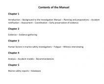 Description: This manual is intended as support material for national marine investigation organizations which conduct investigations under the IMO Casualty Investigation Code (CI Code), which came into force on 1 January 2010. It has been collated from various sources and contains examples of industry best practice to assist investigators and investigation organizations in carrying out their roles. The intention of the manual is to build on the guidelines agreed by the IMO, to provide investigators with a basic platform from which to develop the necessary skills to carry out efficient and effective investigations, and to provide a ready reference tool.