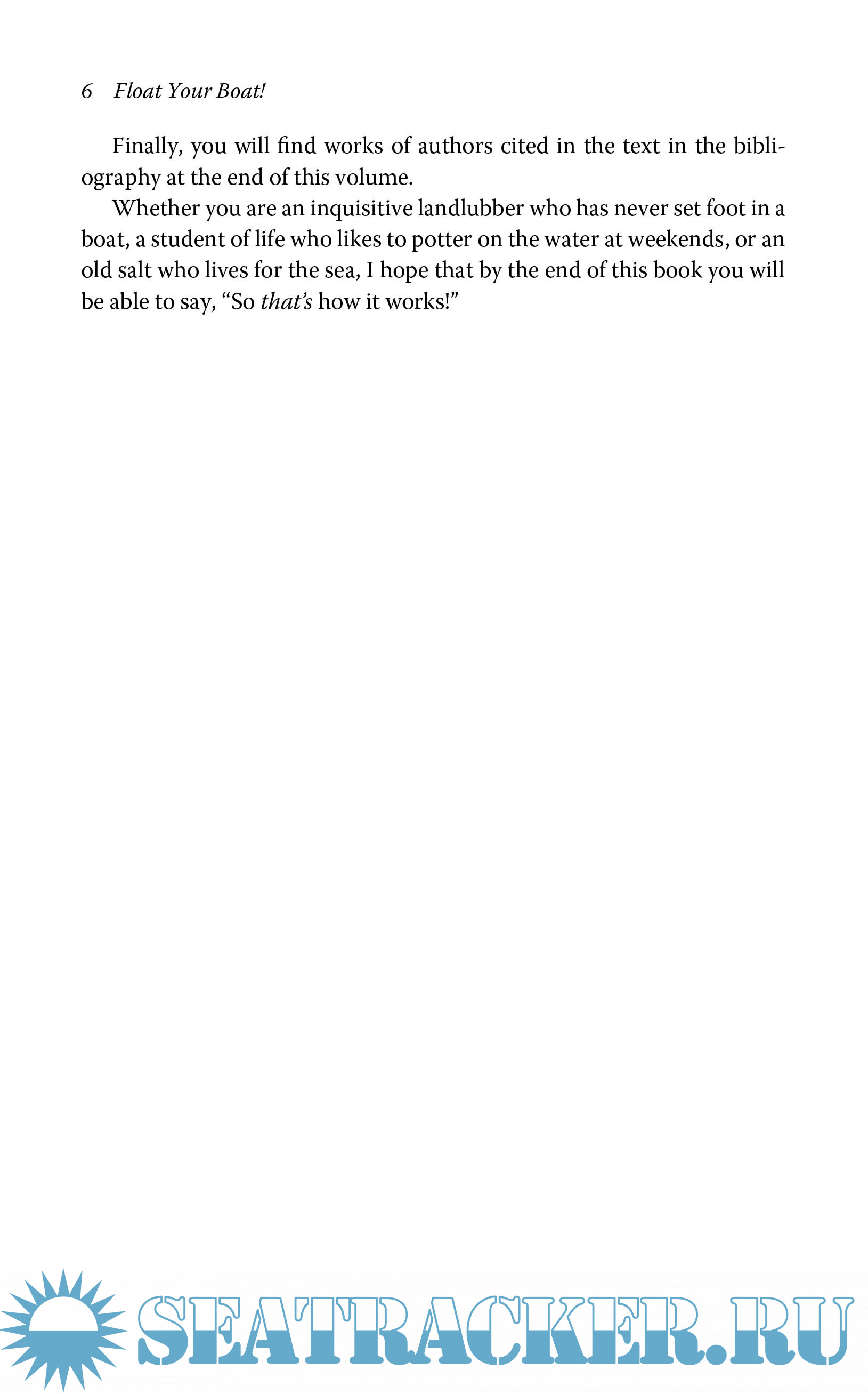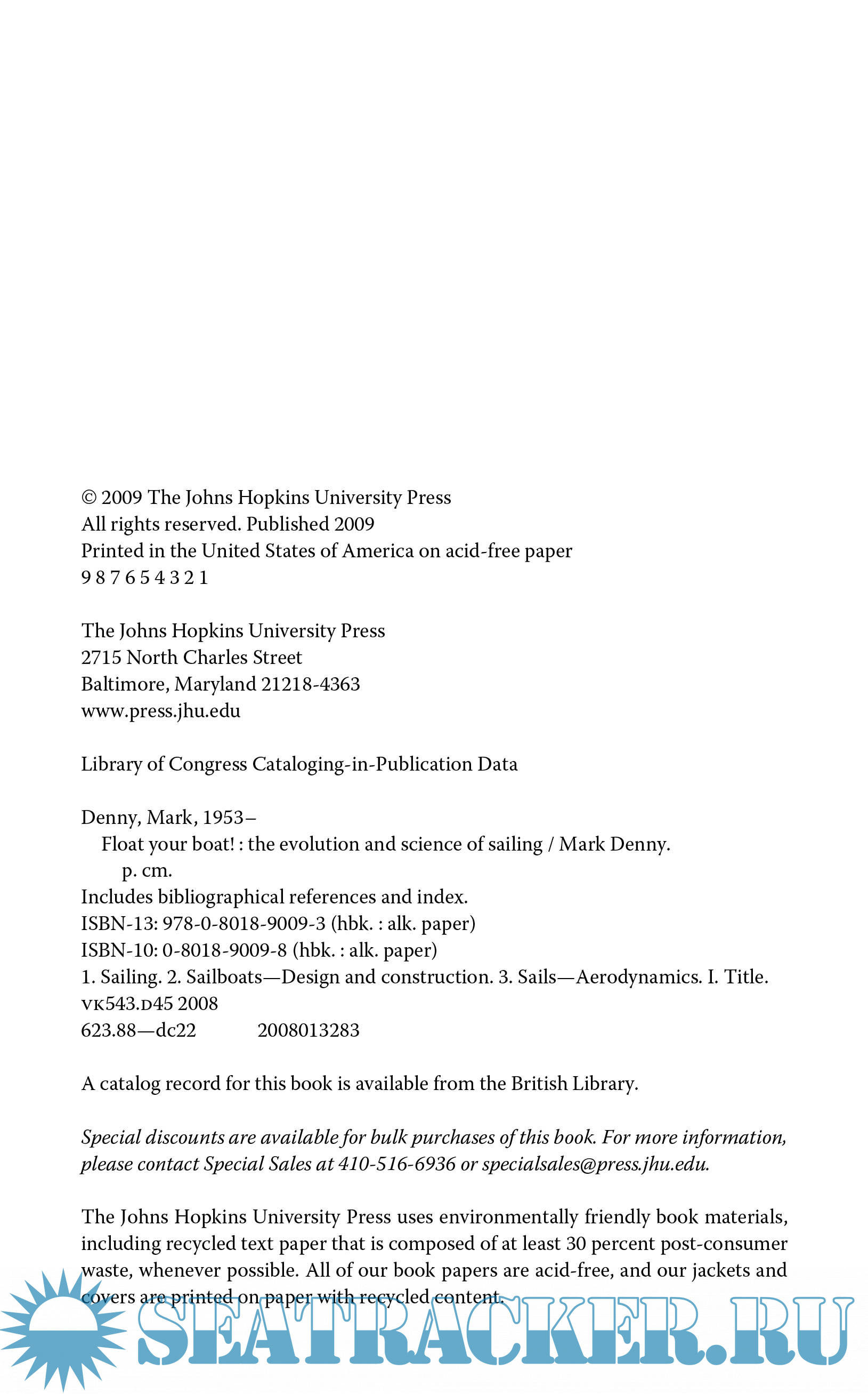 Year: 2009 Language: english Author: Mark Denny Genre: Other Publisher: The Johns Hopkins University Press ISBN: 978-0-8018-9009-3 Format: PDF Quality: eBook Pages count: 275 Description: An estimated 4.1 million people in the United States participate in recreational sailing. Yet the large library of sailing literature leaves many of them high and dry. On one side are technical guides for America’s Cup boat-builders; on the other, simplistic books for weekend sailors with little interest in science. In Float Your Boat! professional and amateur boaters alike will find intelligent and understandable answers to such questions as: What were the key innovations that made sailboats more efficient? How do you increase the speed of a boat? How do sailboats travel into the wind? Why are so many explanations of sailing so wrong? Sailing enthusiast and physicist Mark Denny first traces the evolution of the sailing craft, from prehistoric coracles made of animal skins and antlers to the sailboat’s reinvention as a pleasure craft during the Industrial Revolution. He then identifies specific sailing phenomena?how wind drives modern Bermuda sloops, how torque determines stability, why hull speed exists?and provides the key physics principles behind them. Whether you are an inquisitive landlubber who has never set foot in a boat, a casual weekend sailor, or an old salt who lives for the sea, Float Your Boat! is an accessible guide to the physics of sailing. PS See my other releases in the "Yachting, sailing, boating" topic: https://seatracker.ru/tracker...id=54420#results