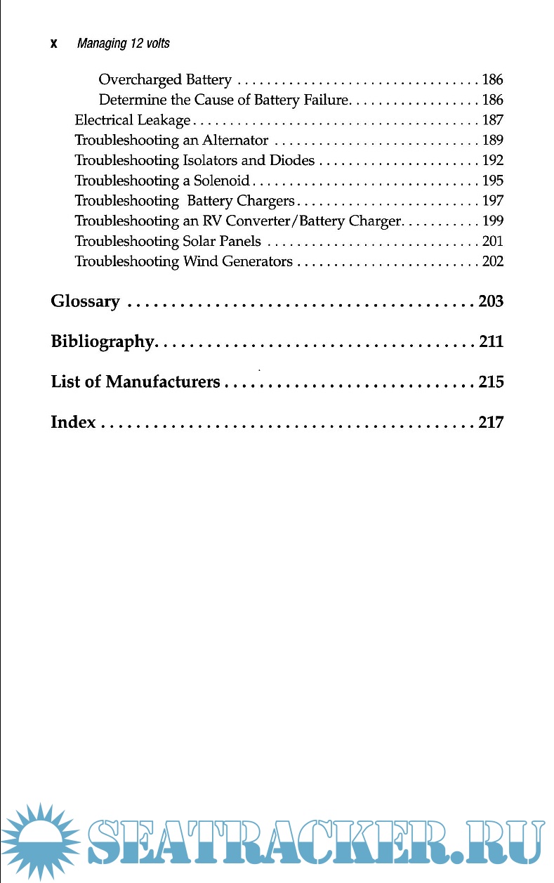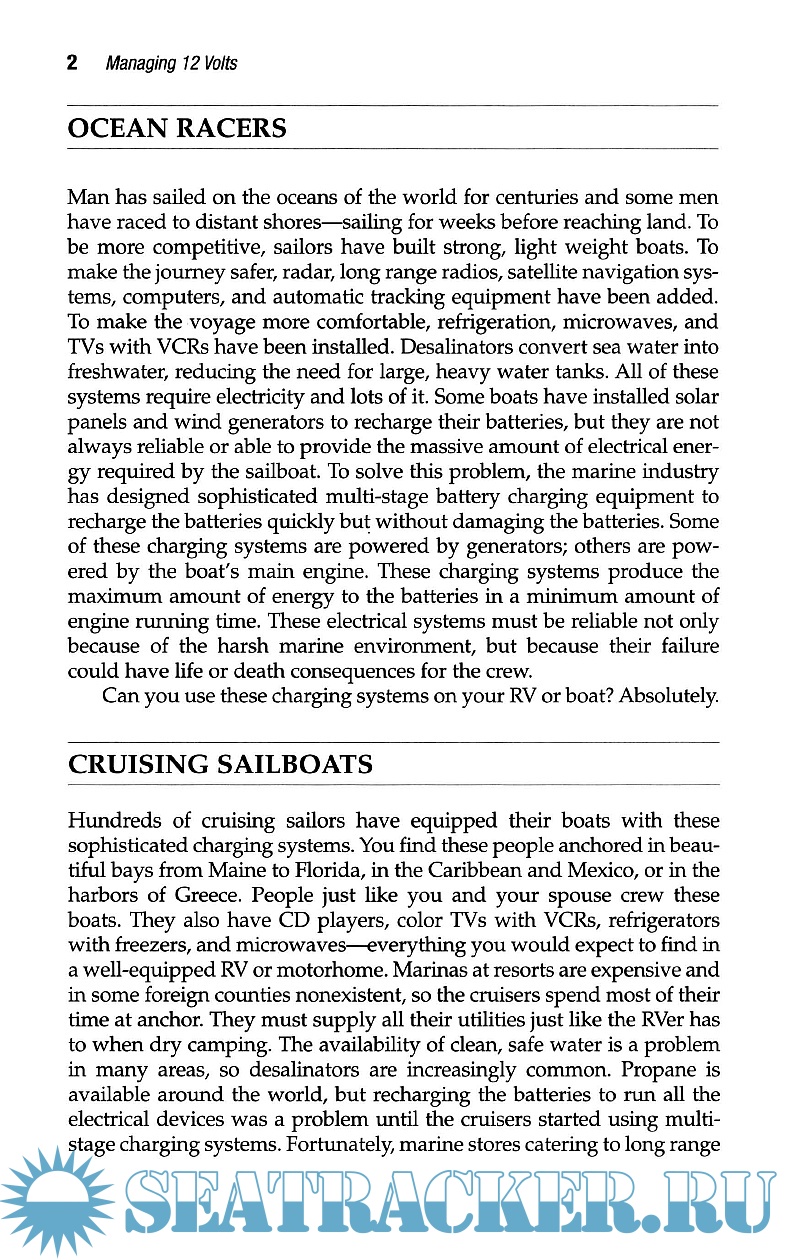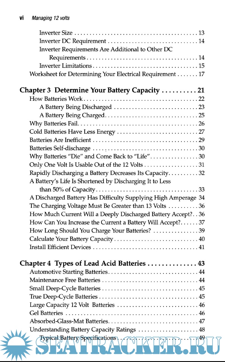 Year: 2002 Language: english Author: Harold Barre Genre: Manual Publisher: Summer Breeze Publishing Edition: 2nd ISBN: 9780964738621 Format: PDF Quality: eBook Pages count: 240 Description: This manual is about how to upgrade, operate and troubleshoot a 12-volt systems with emphasis on understanding what may be wrong with a system and how to improve it with a multi-stage charging system. The author, through diagrams and clear, concise writing, lead the reader to understand, operate, upgrade, repair the 12 V electrical system, how to change parts, calculate the amount of charge batteries contain and power consumption, and how to recharge them properly.
