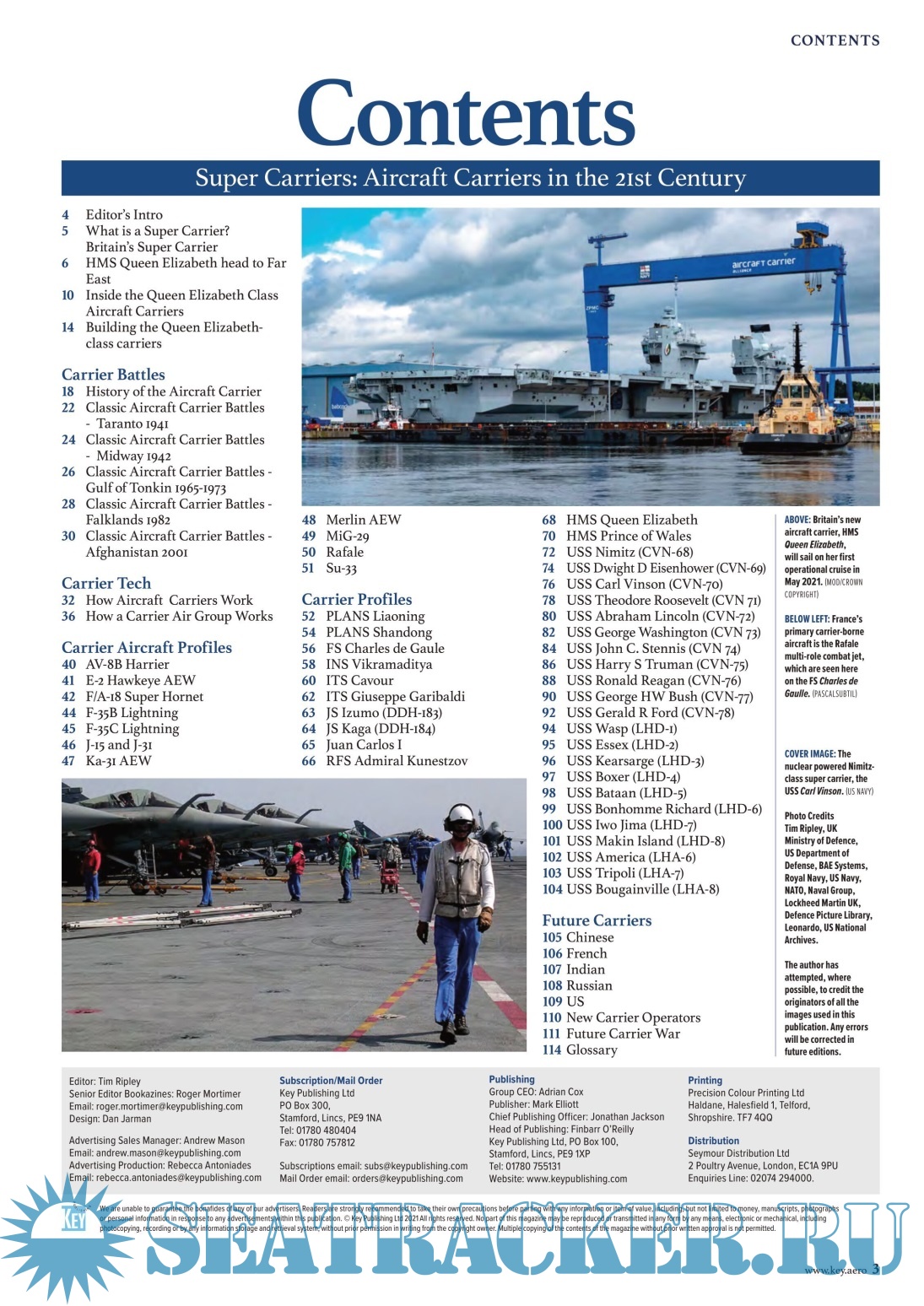 Year: 2021 Language: english Author: Collective Genre: Guide Publisher: Key Publishing Format: PDF Quality: eBook Pages count: 116 Description: The appellation "supercarrier" is not an official designation with any national navy, but a term used predominantly by the media and typically when reporting on new and upcoming aircraft carrier types. It is also used when comparing carriers of various sizes and capabilities, both current and past. It was first used by The New York Times in 1938, in an article about the Royal Navy's HMS Ark Royal, that had a length of 209 meters (686 ft), a displacement of 22,000 tonnes and was designed to carry 72 aircraft. Since then, aircraft carriers have consistently grown in size, both in length and displacement, as well as improved capabilities; in defense, sensors, electronic warfare, propulsion, range, launch and recovery systems, number and types of aircraft carried and number of sorties flown per day.