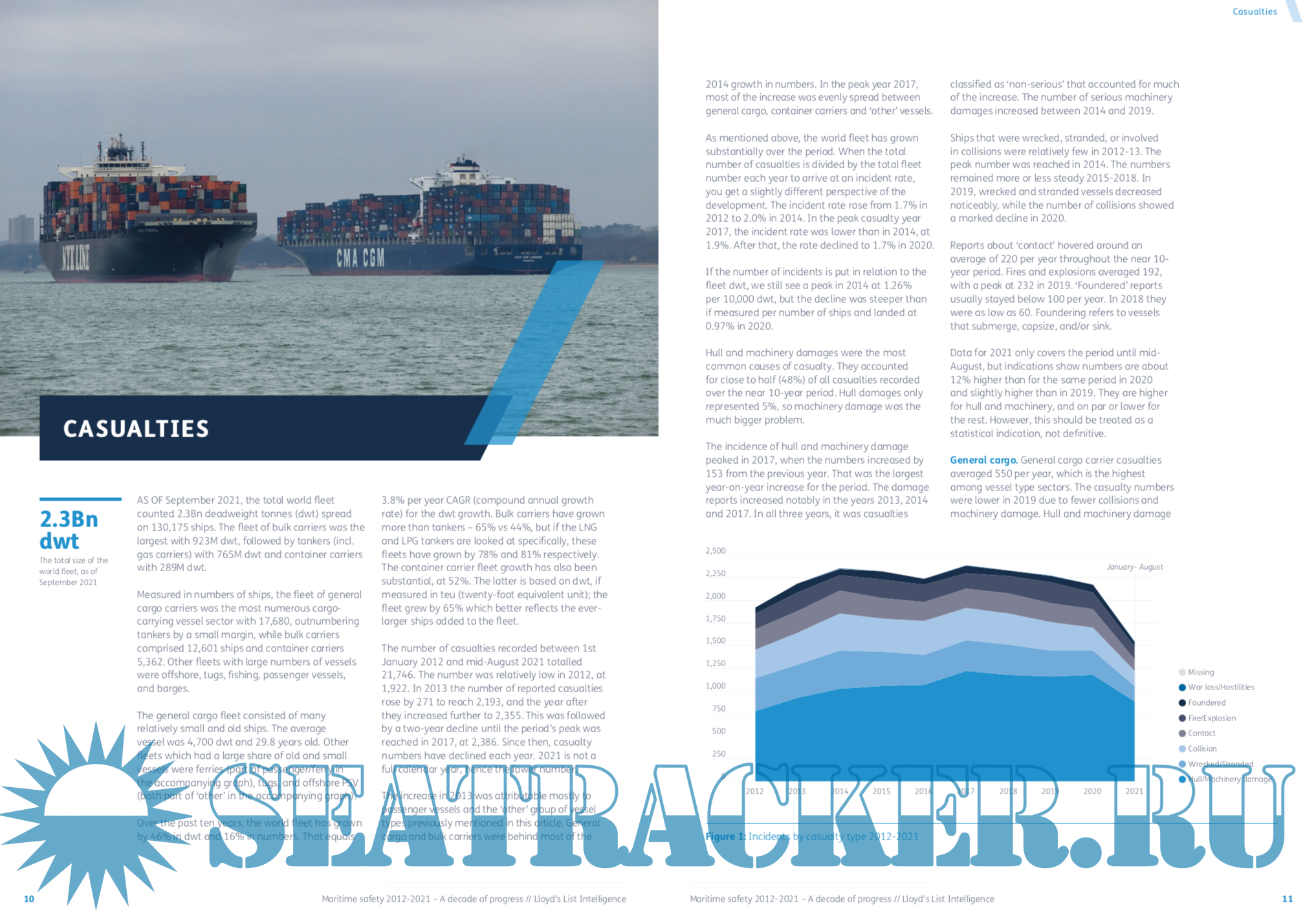 Year: 2021 Language: english Author: Chris Pålsson Genre: Guide Publisher: Lloyd’s List Intelligence Format: PDF Quality: eBook Pages count: 25 Description: This comprehensive report into maritime safety is based upon data drawn from the decade spanning 2012-2021, up to the mid-point of 2021. Using the unique databases of Lloyd’s List Intelligence, we have reviewed 866,000 inspections, 26,000 detentions, 22,000 casualty incidents, and 1,000 losses. Through interrogation of that data, we have identified a gratifying, overall pattern of improvement in maritime safety, although there can be no room or time for complacency, and critical issues lie ahead for shipping. However, it does no harm to look at what has been achieved as a result of targeted and consolidated effort, even as the industry seeks solutions for future issues to be confronted. Enhancements to safety and environmental protection in the past decade have been remarkable.